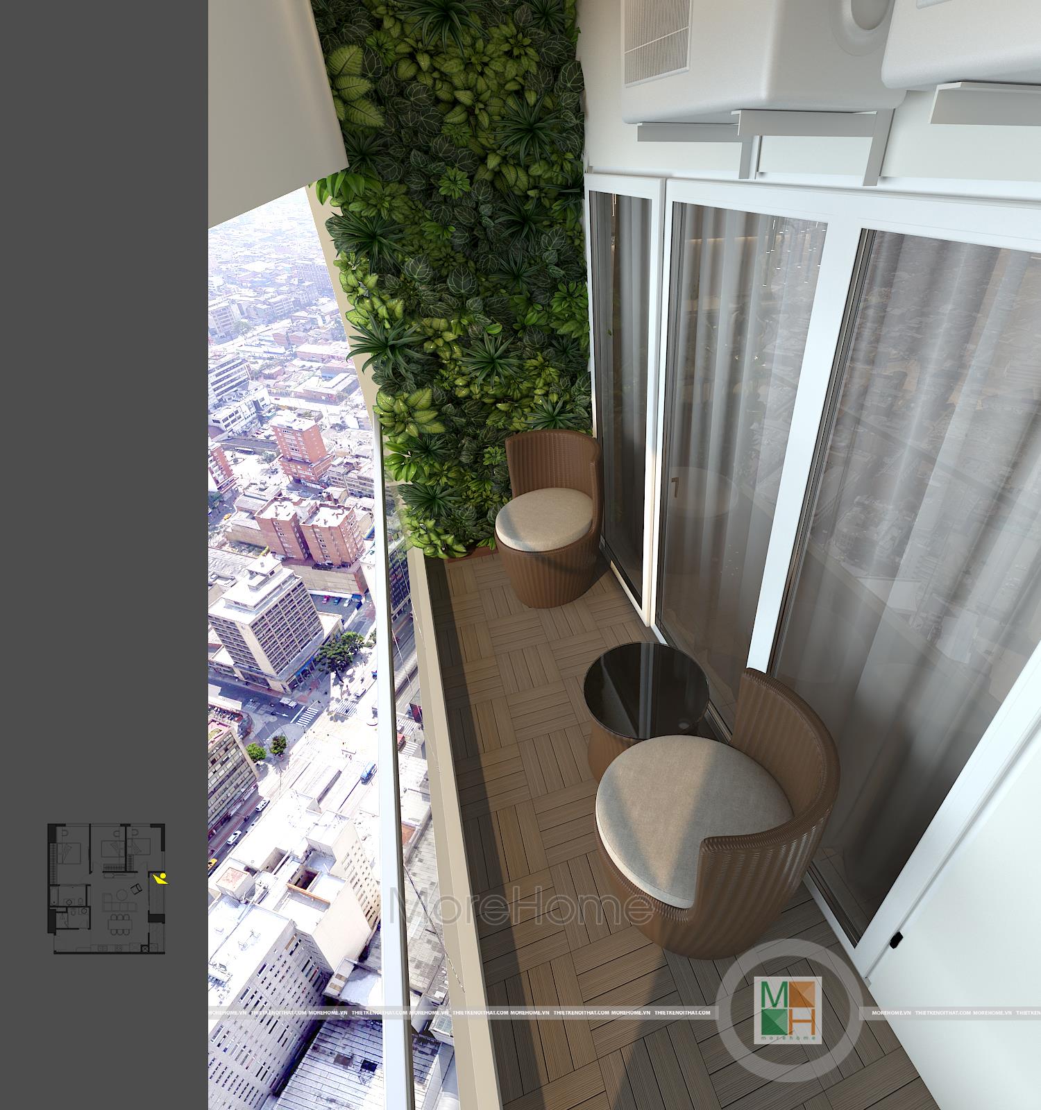 Logia của căn hộ chung cư này thoáng đãng khá rộng rãi được tận dụng làm nơi giặt đồ. Bên trên máy giặt còn được lắp tủ đồ để để đồ linh tinh khác. Một phía logia khác được tận dụng làm không gian thư giãn với bộ bàn ghế thiết kế ấn tượng. Mỗi sáng sớm thức dậy ngồi đây nhâm nhi một tách trà hoặc café thì thật tuyệt vời quá rồi.