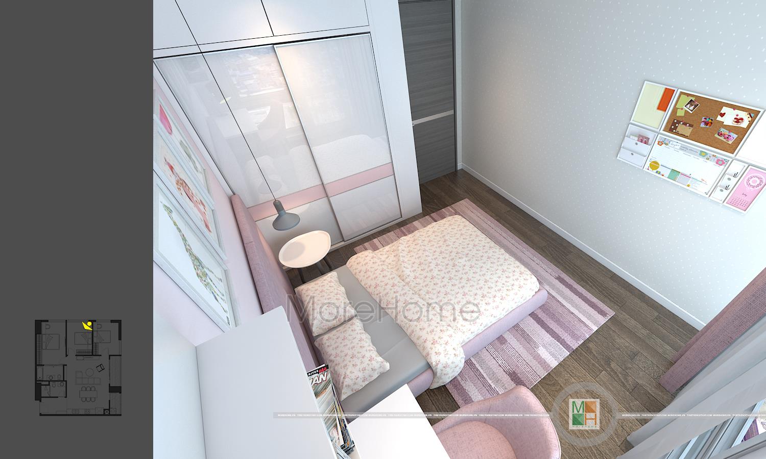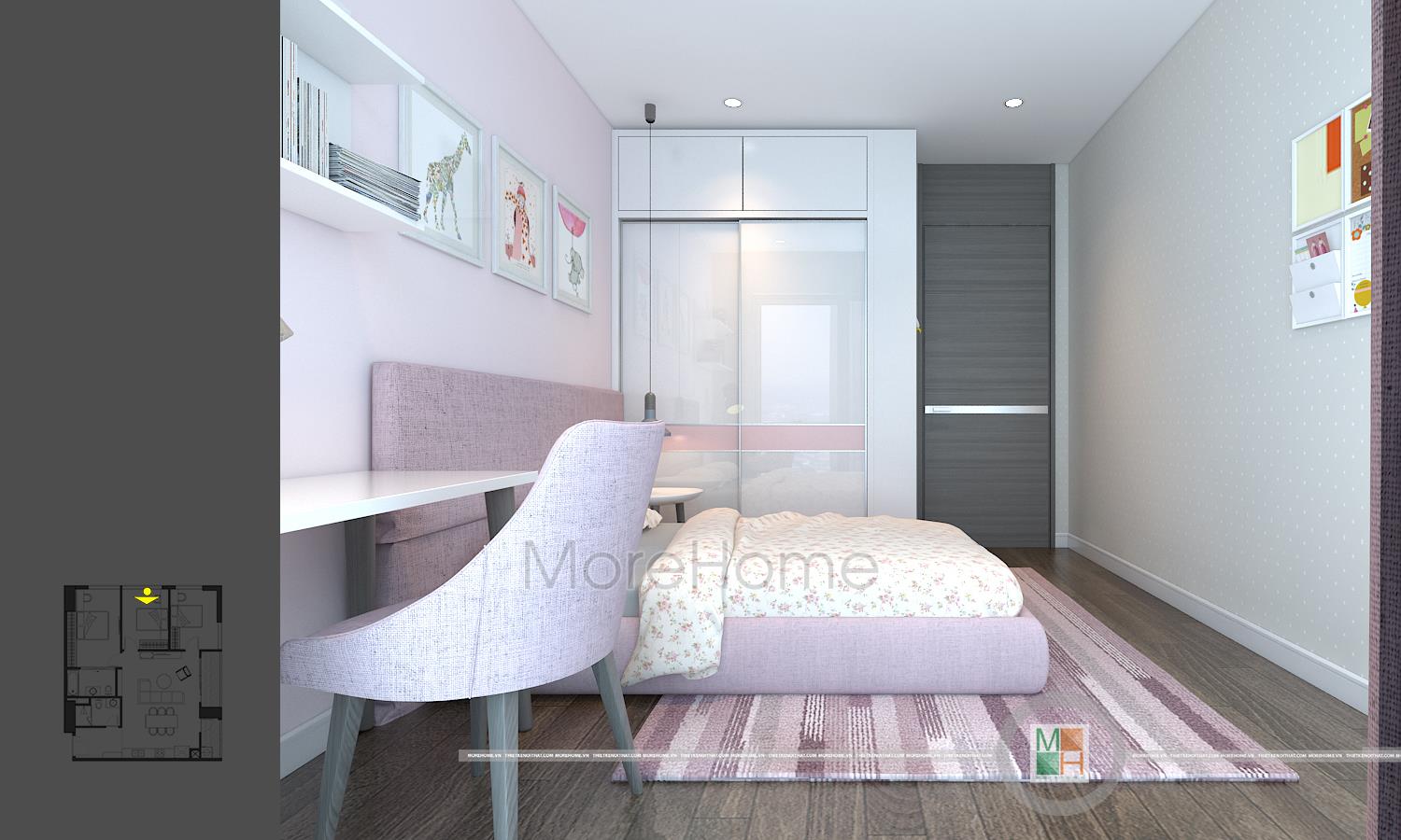 Thiết kế nội thất phòng ngủ trẻ em với 2 phòng, một phòng ngủ bé trai với tông màu xanh nhẹ nhàng và một phòng ngủ bé gái với tông màu hồng đáng yêu. Phòng ngủ bé trai có diện tích rộng hơn nên được bố trí thêm một chiếc kệ tủ trang trí, bàn học của 2 bé đều được đặt cạnh cửa sổ tạo môi trường tốt nhất cho các bé học tập.