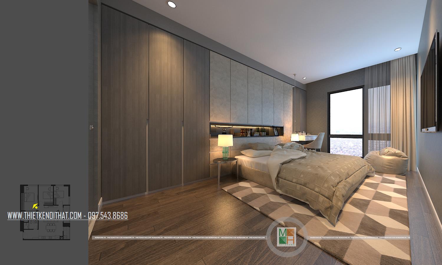 Thiết kế nội thất phòng ngủ master với tông màu gỗ truyền thống. Mảng tường đầu giường làm điểm nhấn trung tâm của căn phòng với hệ thống tủ kệ âm tường với điểm phân tách được dùng để đồ trang trí, bàn trang điểm đặt cạnh đầu giường ngay sát bên là cửa sổ thông thoáng. Nhìn từ tầng cao thì đây là nơi view lý tưởng ra không gian bên ngoài. Nhà vệ sinh trong phòng ngủ master thông thoáng với cửa kính với các thiết bị vệ sinh cao cấp, bồn tắm nằm thư giãn