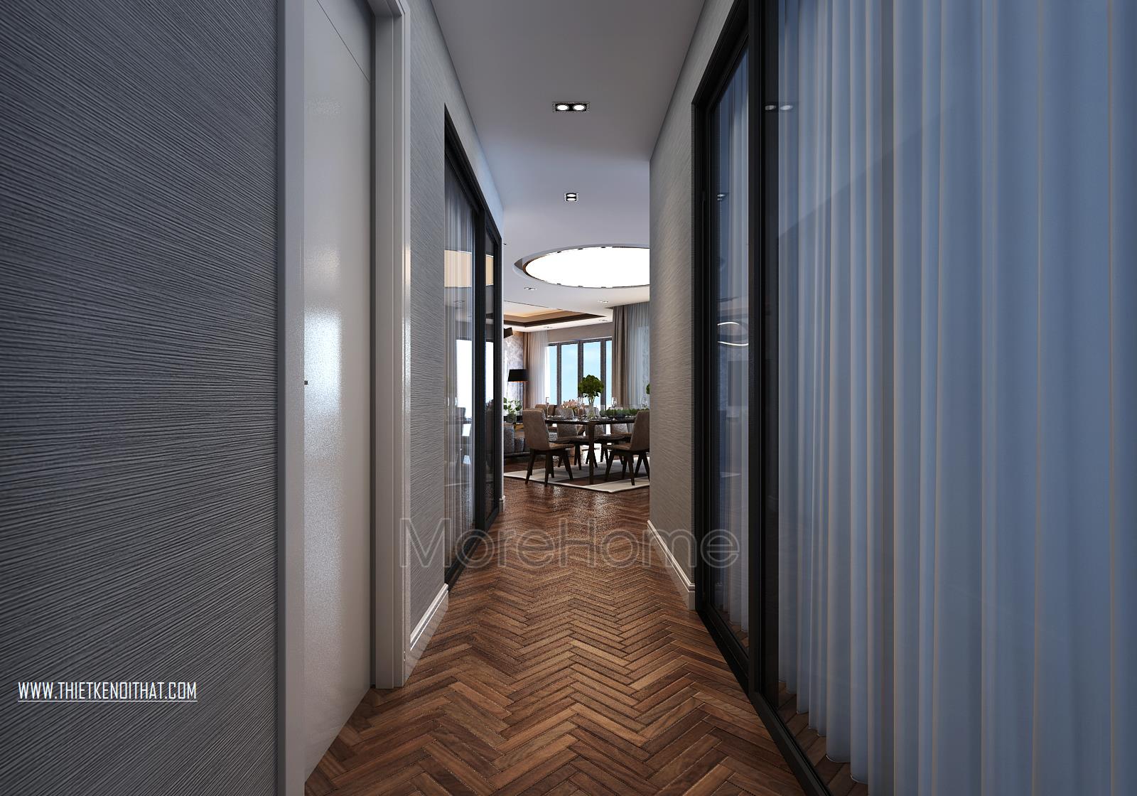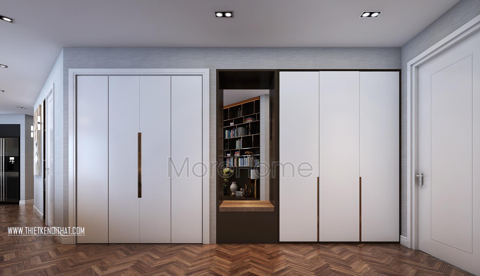 Ngoài ra, vật liệu được ưu ái sử dụng trong thiết kế nội thất căn hộ Royal City này chủ yếu là các vật liệu nhẹ như gỗ, kính cường lực… tạo cảm giác thanh thoát, nhẹ nhàng mà không làm ảnh hưởng đến diện tích phòng như các thiết kế built-in thô cứng.