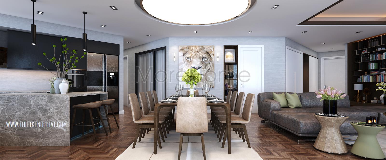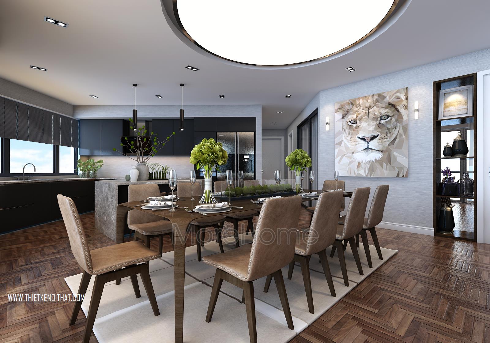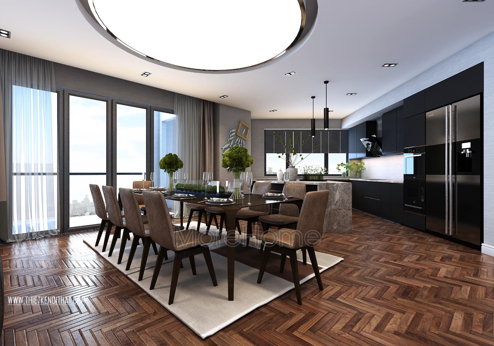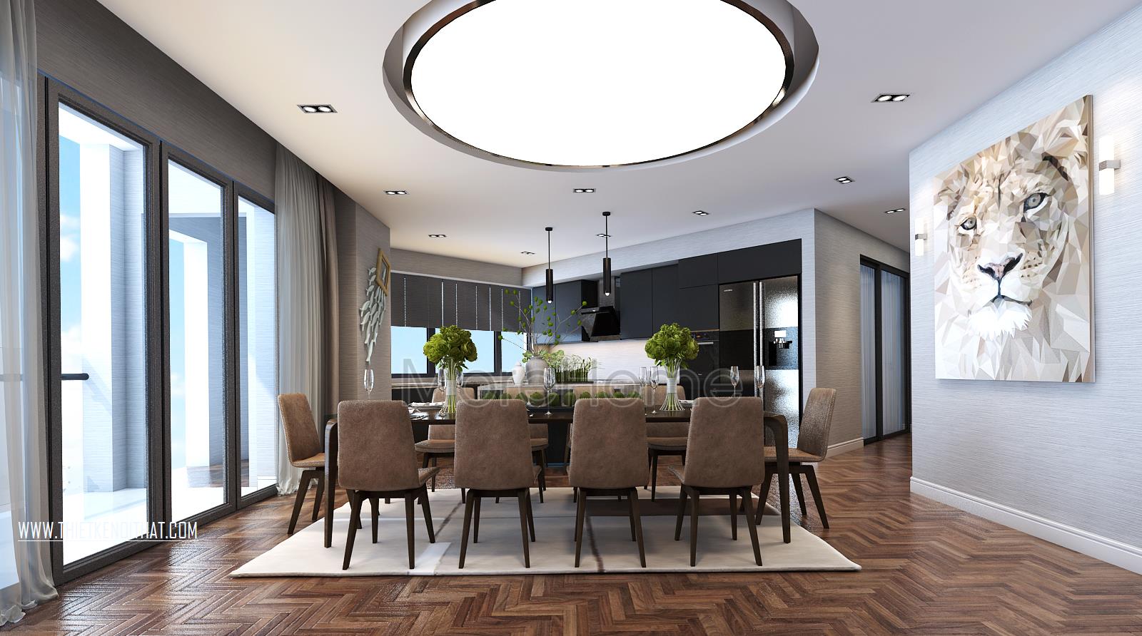 Thiết kế bàn ăn hiện đại sử dụng khung gỗ vuông vắn gợi sự trẻ trung và khỏe khoắn. Tone màu nâu trầm kết hợp đồng bộ với thiết kế gỗ xuyên suốt căn hộ. Bàn ăn và bếp liền kề mang đến sự tiện lợi cho gia chủ. Bên cạnh đó, thiết kế không hề có vách ngăn giúp diện tích căn phòng được cơi nới đáng kể và giúp tăng tầm nhìn, tạo sự gần gũi giữa các thành viên trong gia đình.