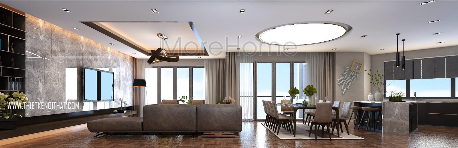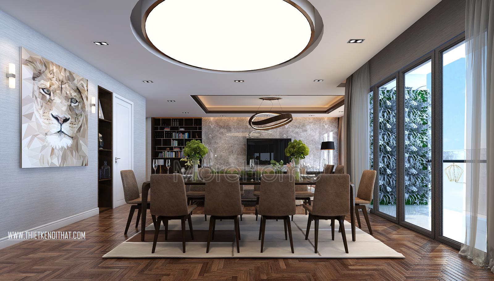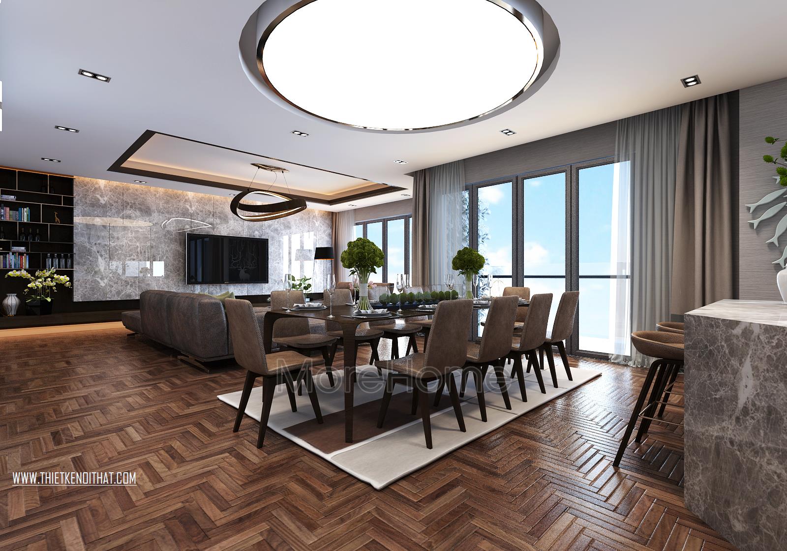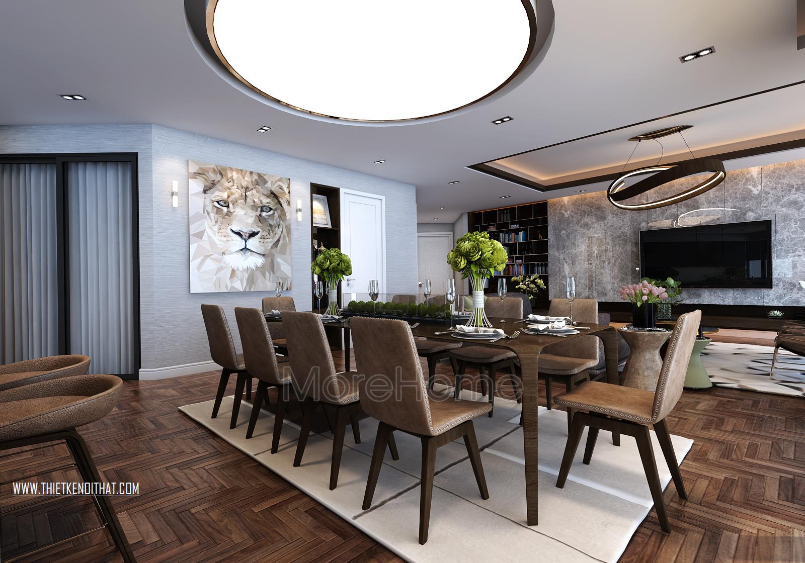 Thiết kế bàn ăn hiện đại sử dụng khung gỗ vuông vắn gợi sự trẻ trung và khỏe khoắn. Tone màu nâu trầm kết hợp đồng bộ với thiết kế gỗ xuyên suốt căn hộ. Bàn ăn và bếp liền kề mang đến sự tiện lợi cho gia chủ. Bên cạnh đó, thiết kế không hề có vách ngăn giúp diện tích căn phòng được cơi nới đáng kể và giúp tăng tầm nhìn, tạo sự gần gũi giữa các thành viên trong gia đình.