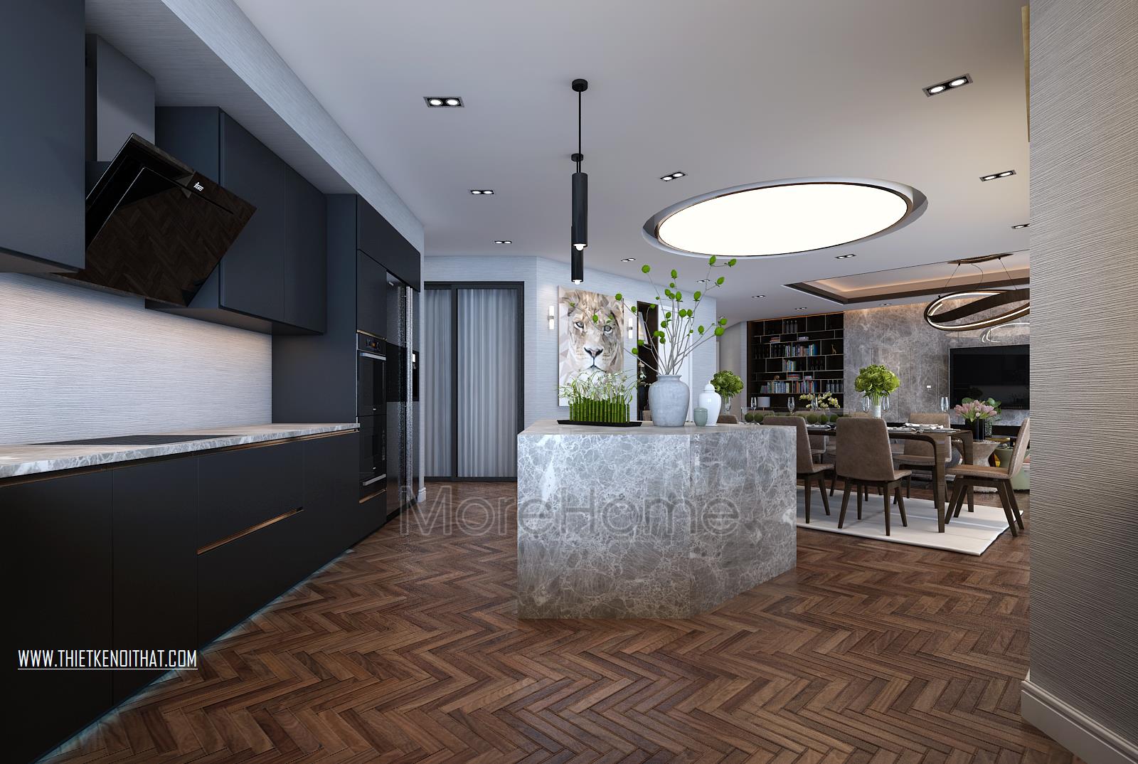 Thiết kế bếp hiện đại khéo léo tận dụng không gian góp của căn hộ, kiến trúc sư đã xử lý một cách khéo léo để không làm mất đi sự hài hòa và độ phẳng trong thiết kế. Tone màu ghi xám và đen được sử dụng giúp mang đến sự hài hòa và cân bằng cho các thiết kế tối và trầm, ánh kim loại cũng chính là một xu hướng thiết kế được ưa chuộng trong năm nay. Không gian thiết kế xanh cũng được kiến trúc sư khéo léo sắp đặt giúp không gian trở nên thân thiện và tươi mát hơn.