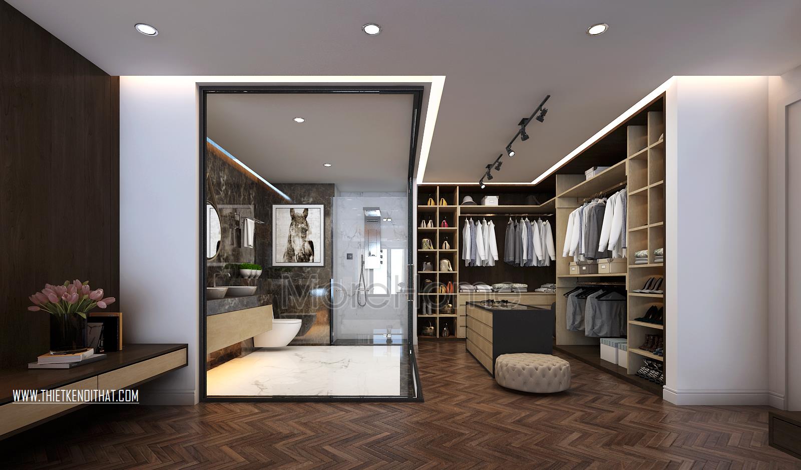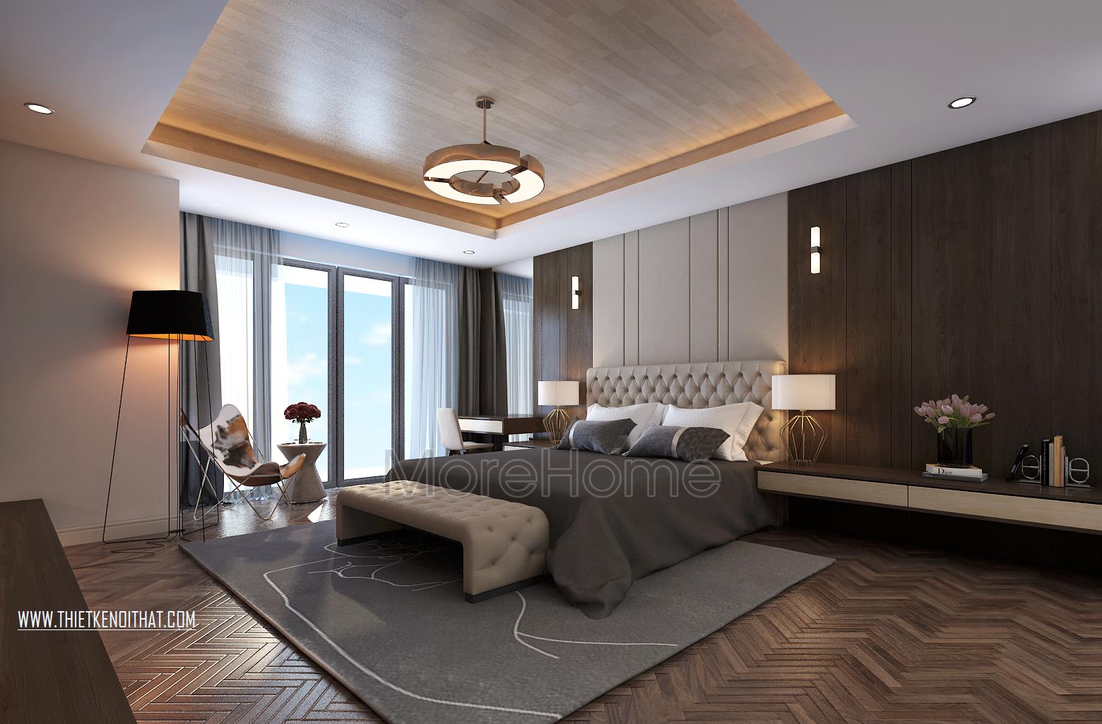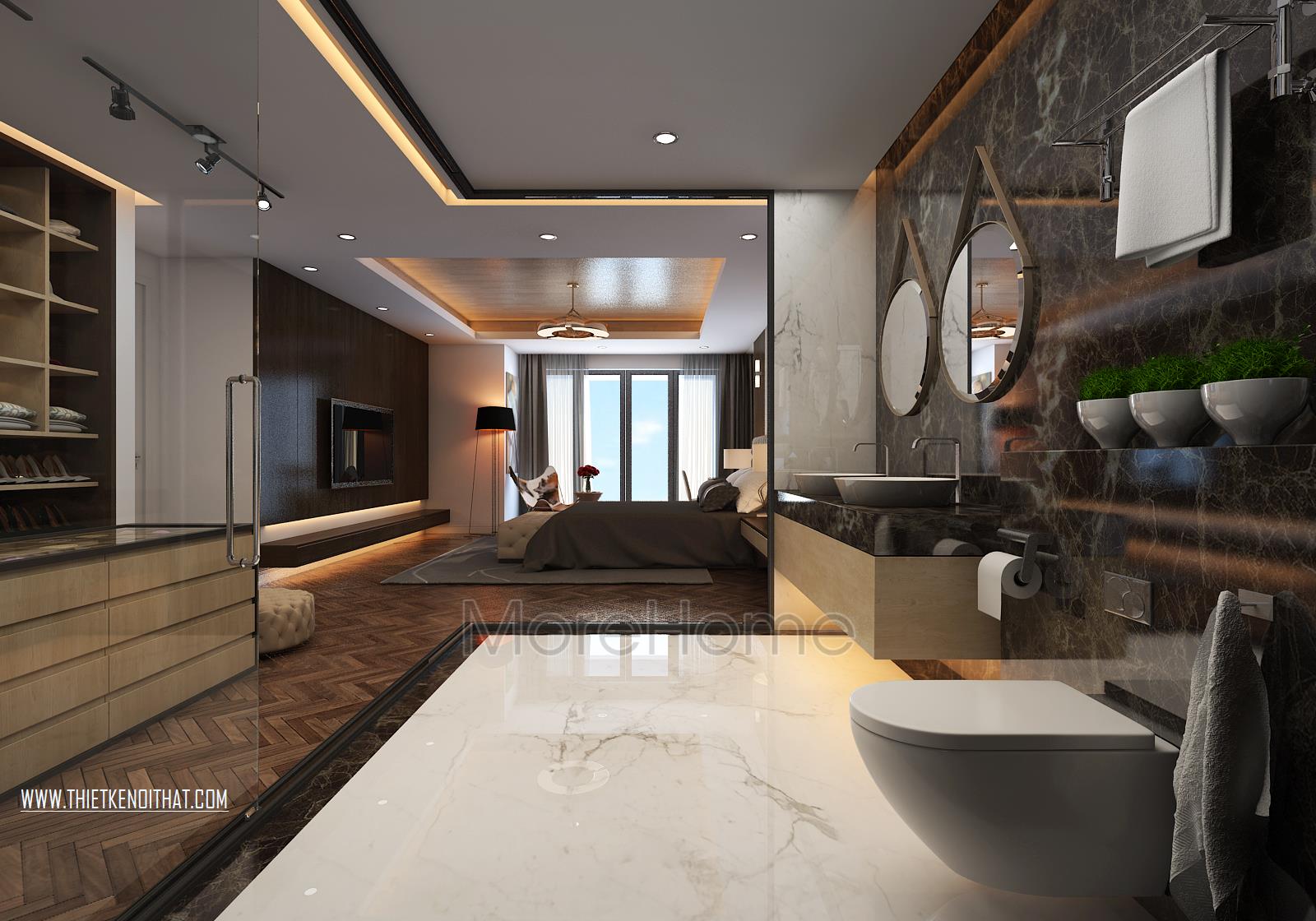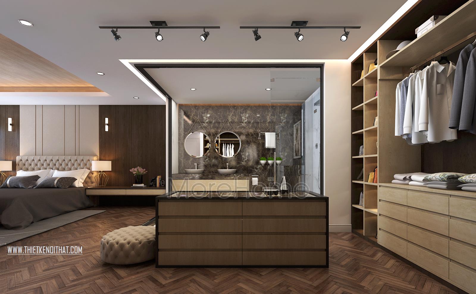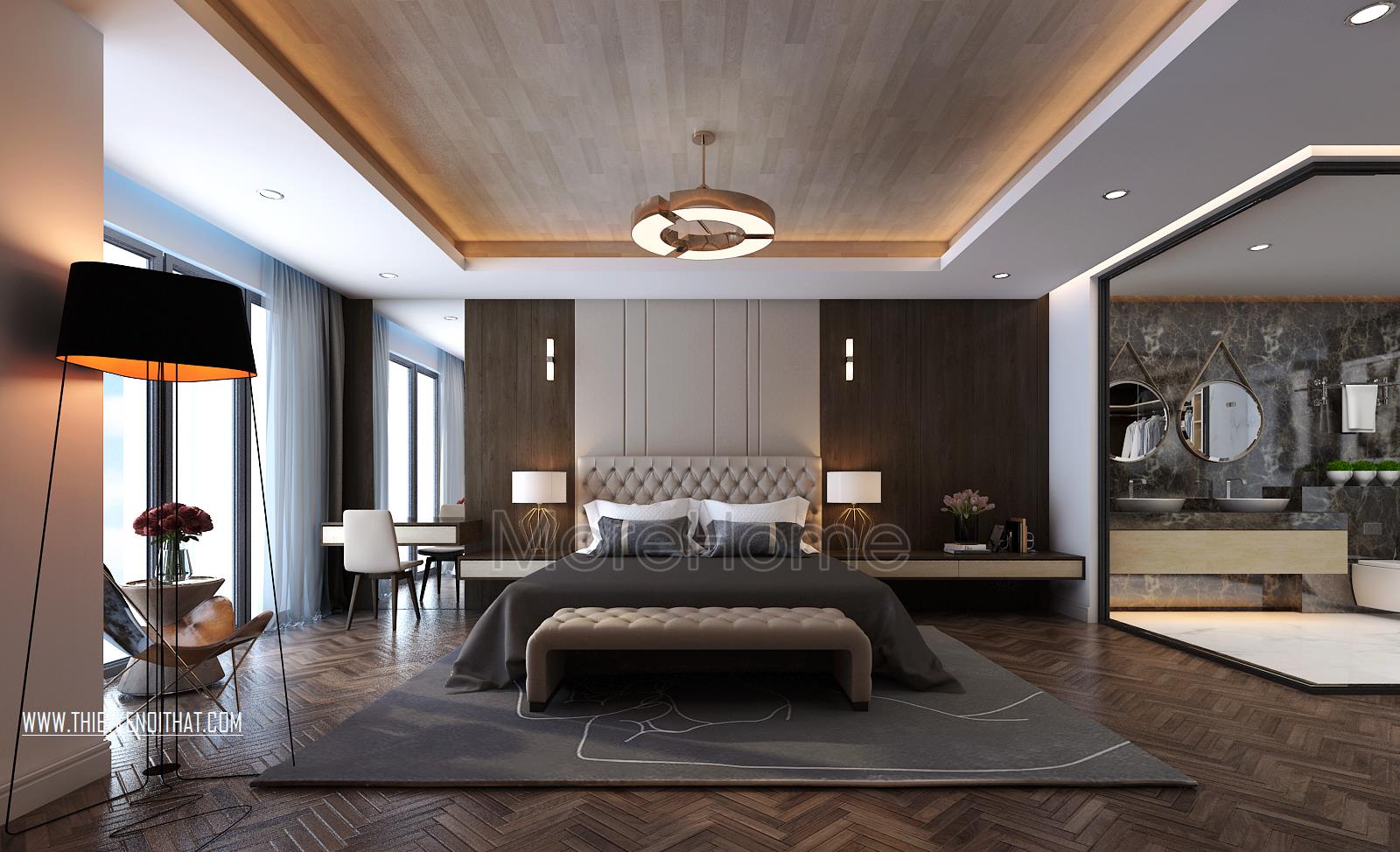 Tiếp đến là thiết kế nội thất phòng ngủ Master phong cách hiện đại. Tone màu ghi sáng và nâu veneer trầm được sử dụng tạo độ cân bằng cho không gian. Thiết kế nhà vệ sinh ngăn cách bởi tường kính cường lực là một trong những dụng ý của tác giả giúp mang đến cảm giác cơi nới về mặt diện tích và giúp tạo ấn tượng sâu sắc về một không gian cách tân sáng tạo. Bên cạnh đó, thiết kế tủ quần sao đa tầng nhiều ngăn với thiết kế không cánh tạo độ mở và tiện lợi hơn cho gia chủ. Điểm cuối cùng đem lại nét đẹp cho căn phòng chính là sự kết hợp hài hòa của ánh sáng, vẻ đẹp ánh sáng được phản chiếu nhẹ nhàng qua từng khung cửa và mang lại hứng khởi cho các thành viên trong gia đình.