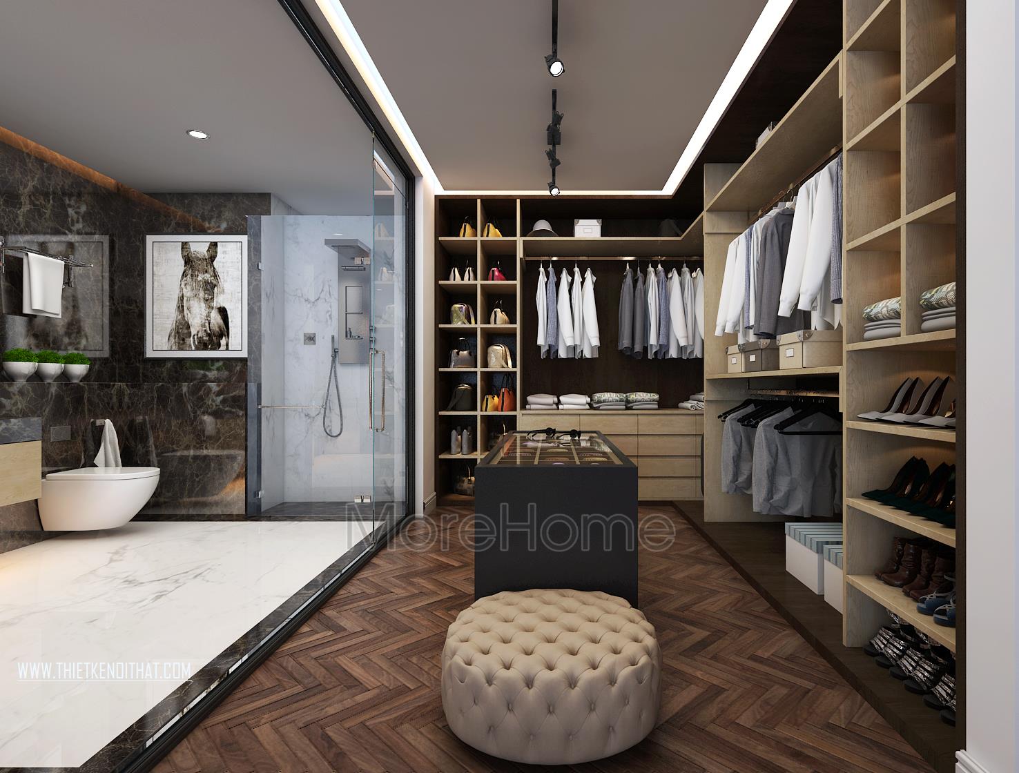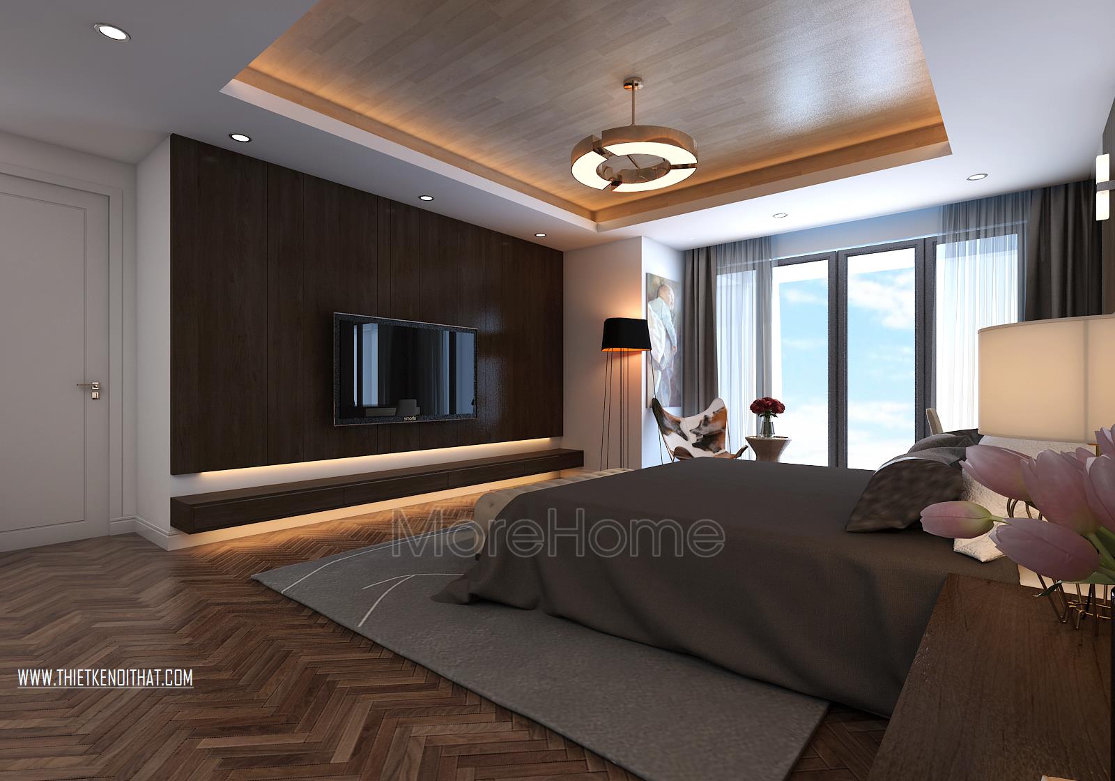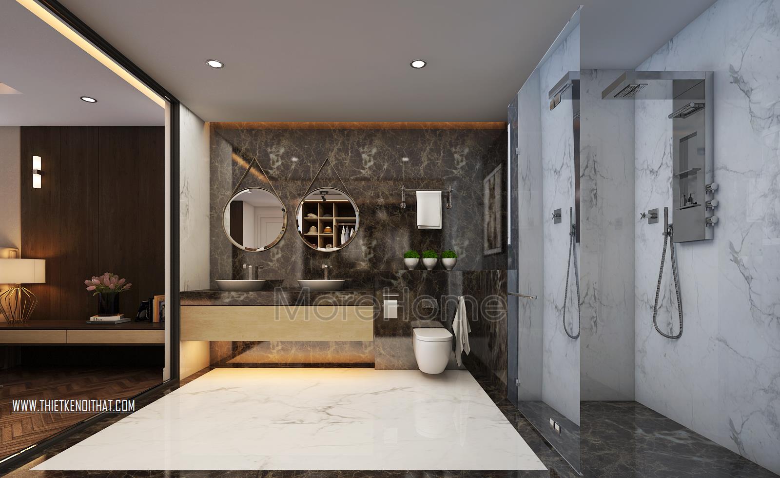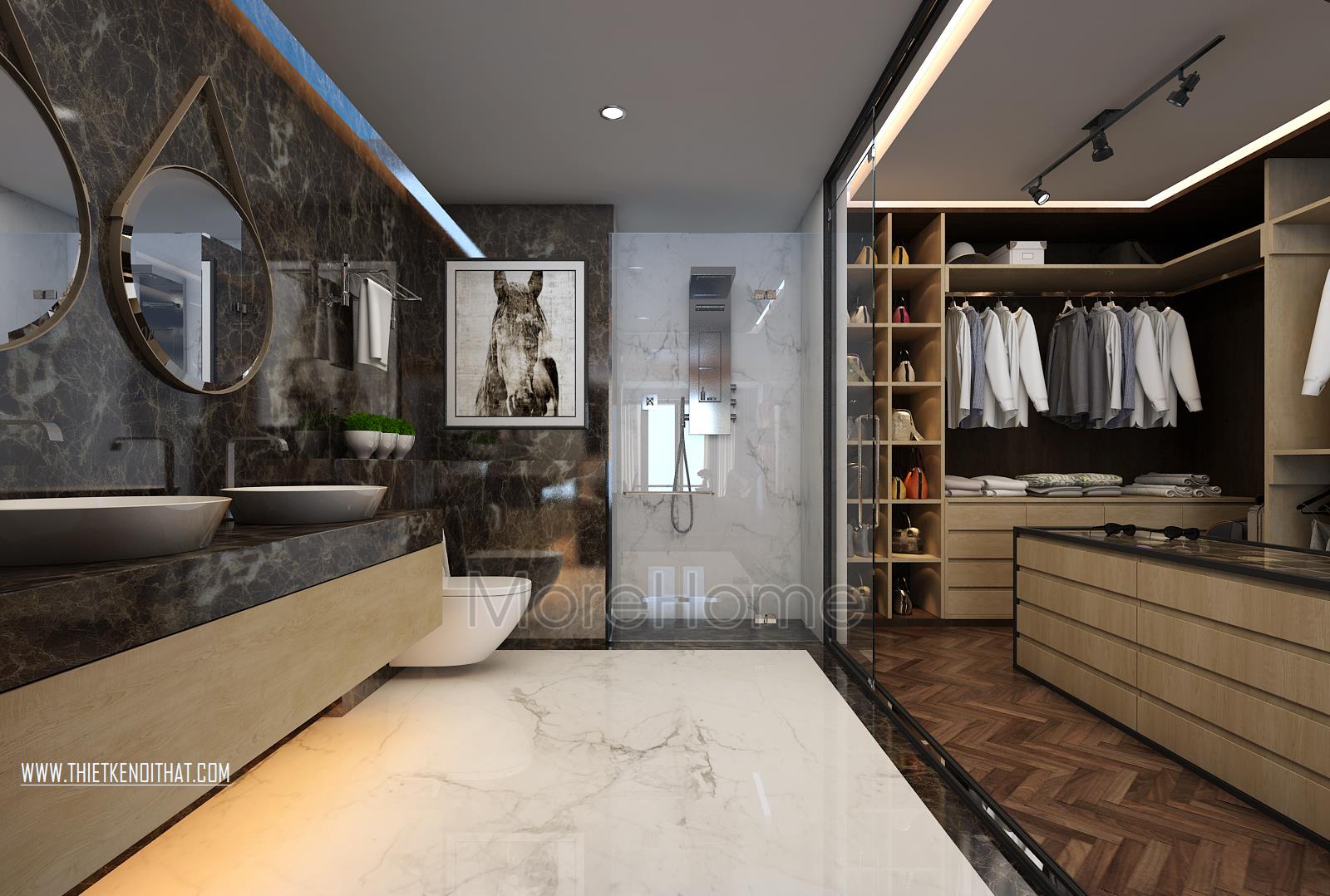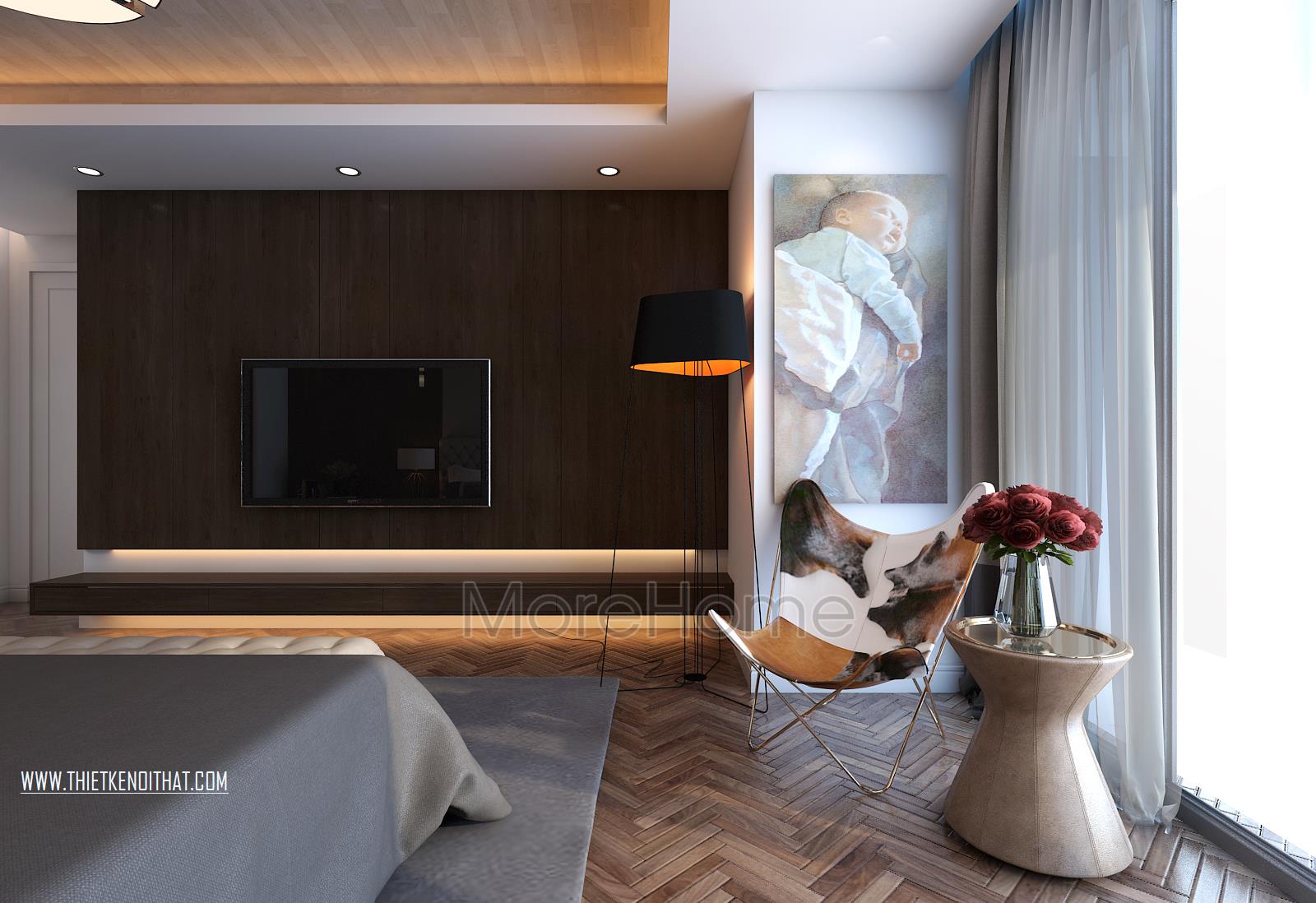 Tiếp đến là thiết kế nội thất phòng ngủ Master phong cách hiện đại. Tone màu ghi sáng và nâu veneer trầm được sử dụng tạo độ cân bằng cho không gian. Thiết kế nhà vệ sinh ngăn cách bởi tường kính cường lực là một trong những dụng ý của tác giả giúp mang đến cảm giác cơi nới về mặt diện tích và giúp tạo ấn tượng sâu sắc về một không gian cách tân sáng tạo. Bên cạnh đó, thiết kế tủ quần sao đa tầng nhiều ngăn với thiết kế không cánh tạo độ mở và tiện lợi hơn cho gia chủ. Điểm cuối cùng đem lại nét đẹp cho căn phòng chính là sự kết hợp hài hòa của ánh sáng, vẻ đẹp ánh sáng được phản chiếu nhẹ nhàng qua từng khung cửa và mang lại hứng khởi cho các thành viên trong gia đình.
