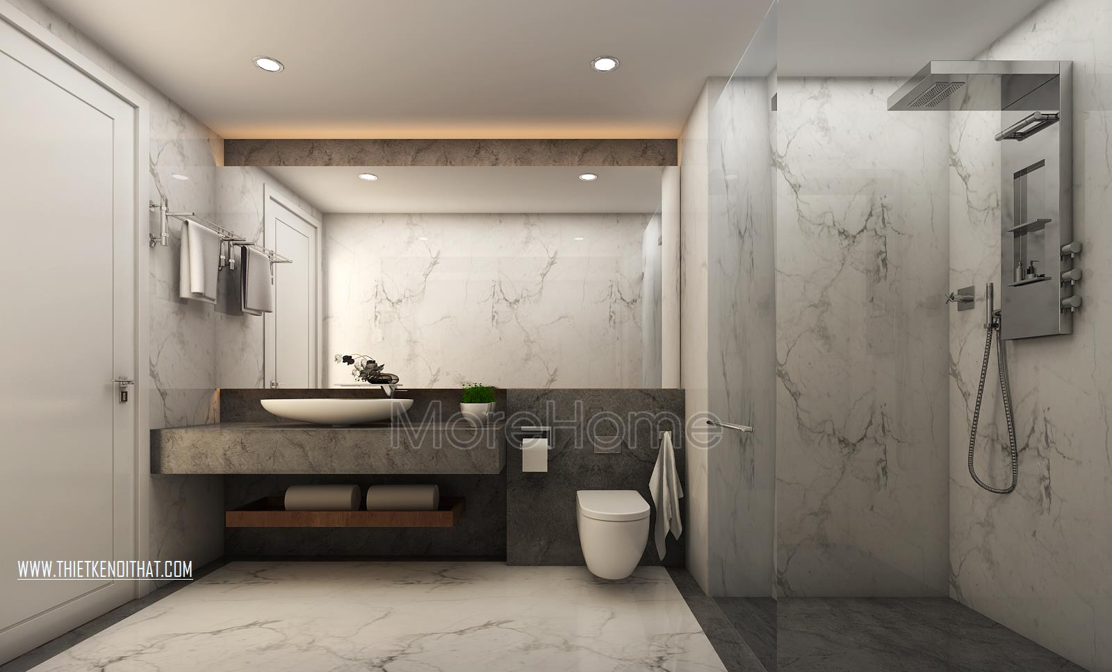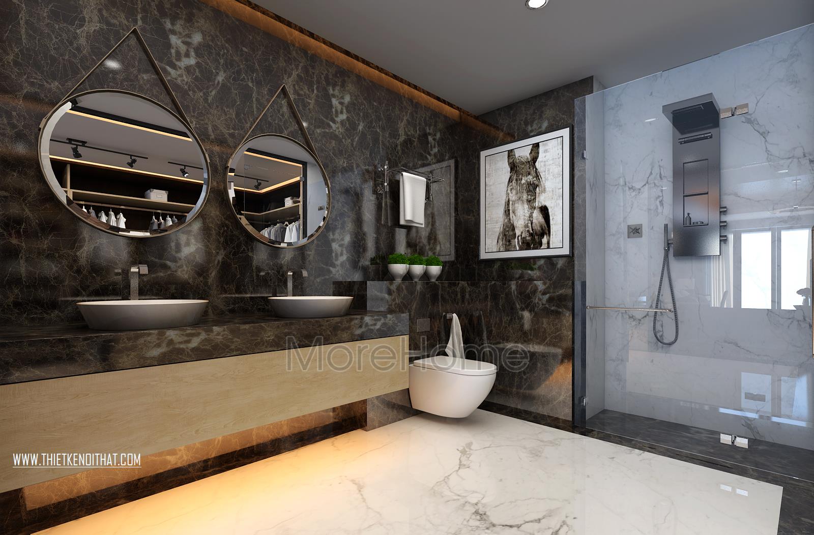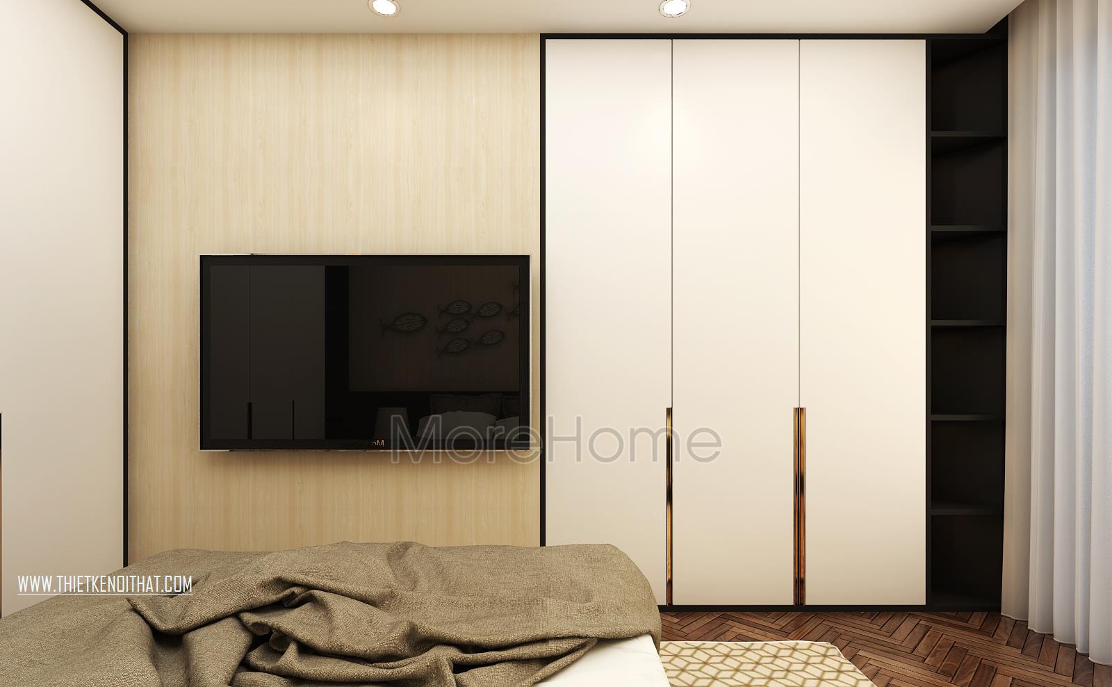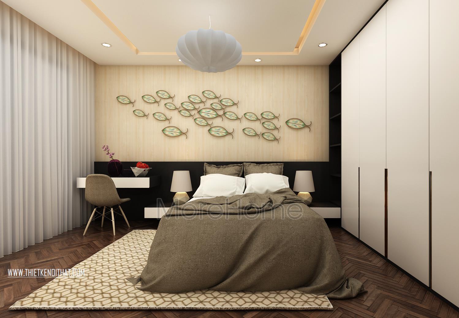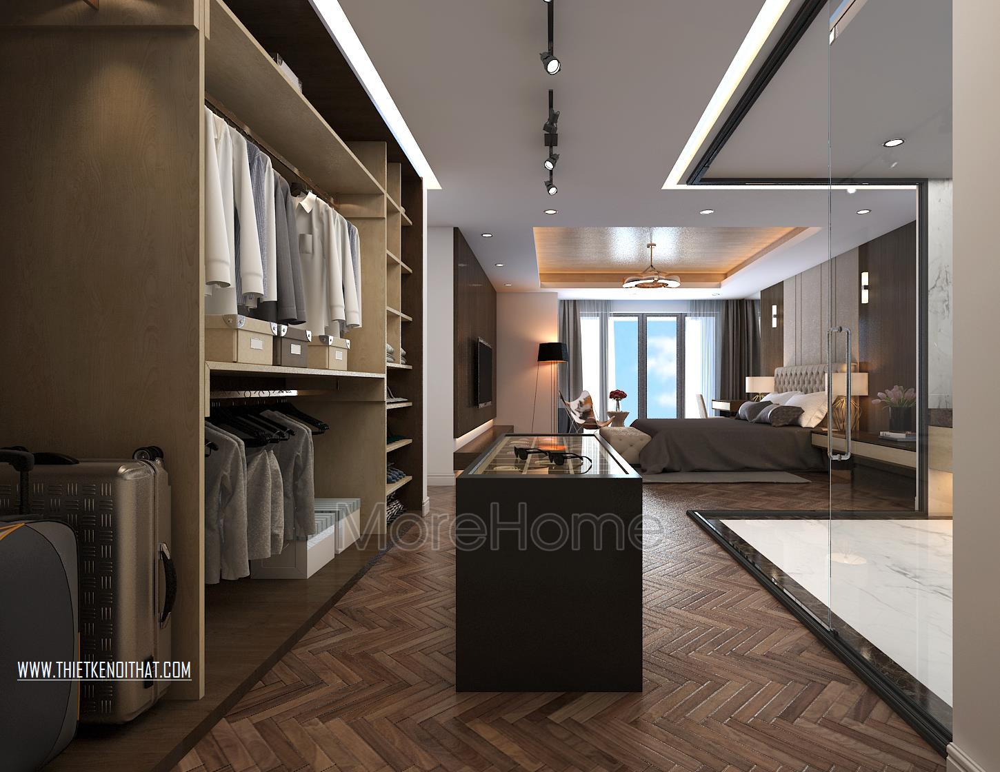 Tiếp đến là thiết kế nội thất phòng ngủ Master phong cách hiện đại. Tone màu ghi sáng và nâu veneer trầm được sử dụng tạo độ cân bằng cho không gian. Thiết kế nhà vệ sinh ngăn cách bởi tường kính cường lực là một trong những dụng ý của tác giả giúp mang đến cảm giác cơi nới về mặt diện tích và giúp tạo ấn tượng sâu sắc về một không gian cách tân sáng tạo. Bên cạnh đó, thiết kế tủ quần sao đa tầng nhiều ngăn với thiết kế không cánh tạo độ mở và tiện lợi hơn cho gia chủ. Điểm cuối cùng đem lại nét đẹp cho căn phòng chính là sự kết hợp hài hòa của ánh sáng, vẻ đẹp ánh sáng được phản chiếu nhẹ nhàng qua từng khung cửa và mang lại hứng khởi cho các thành viên trong gia đình.
