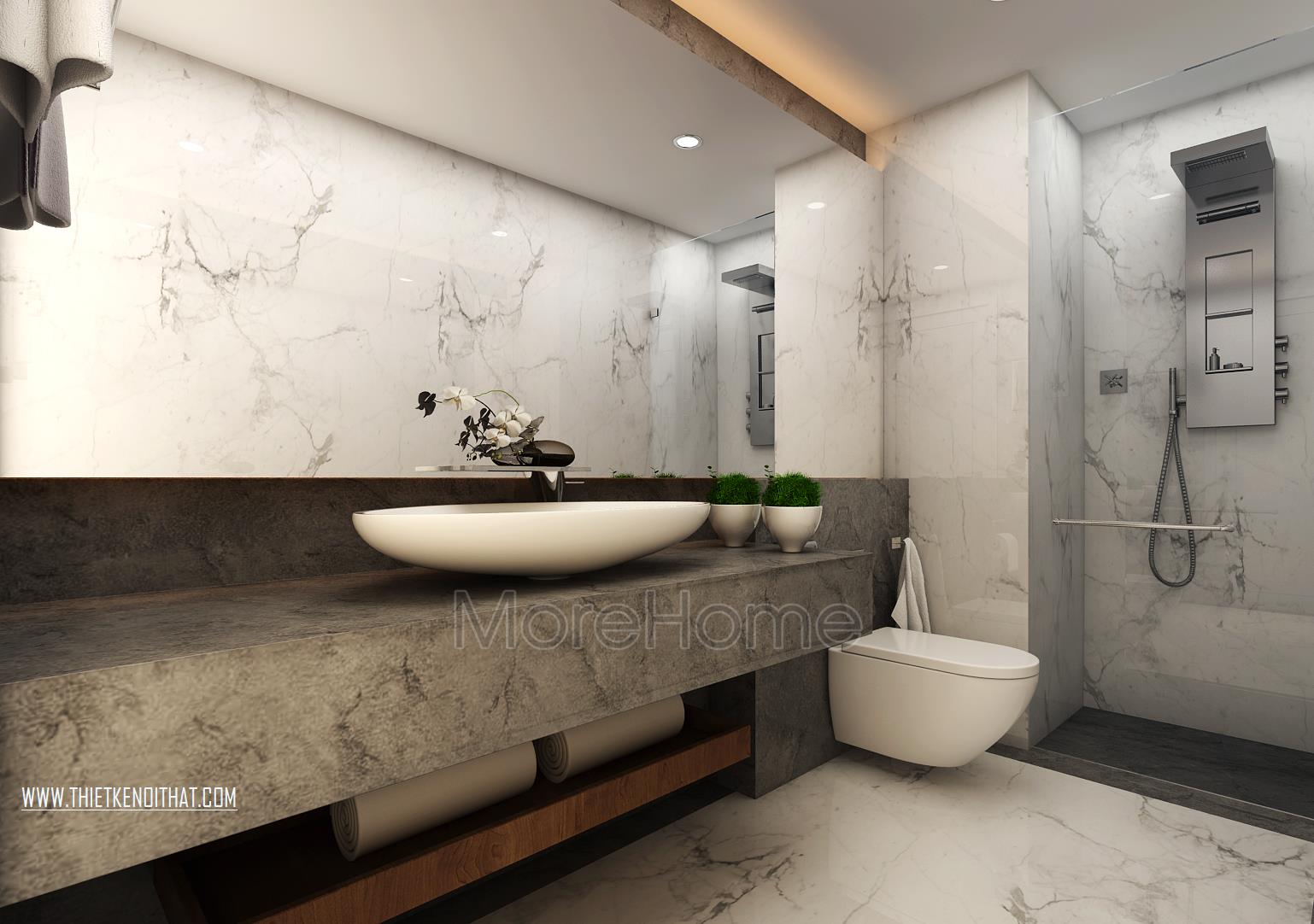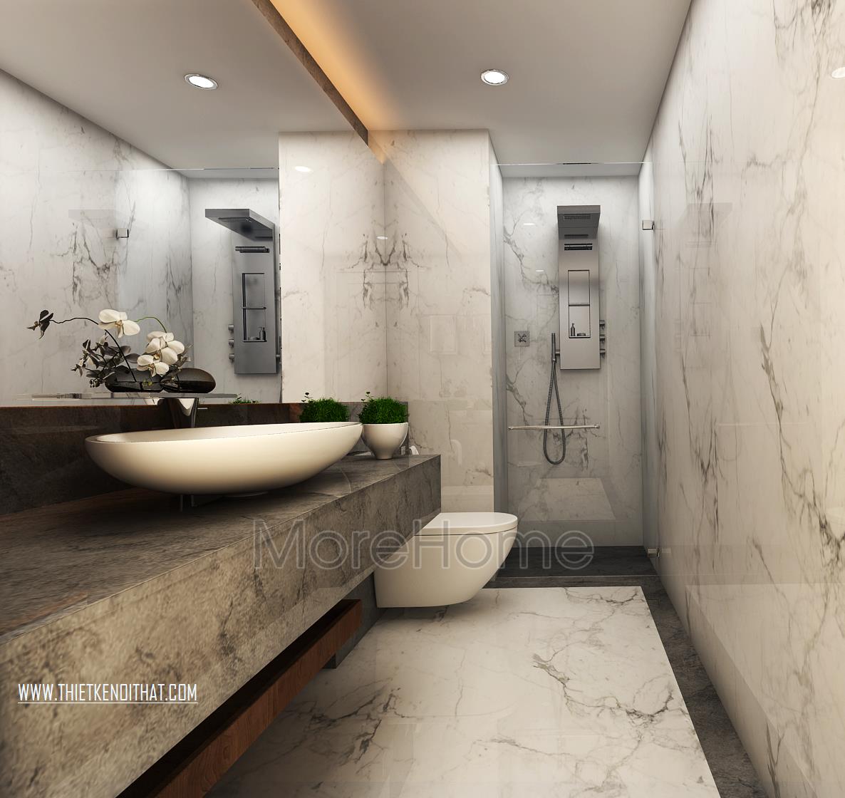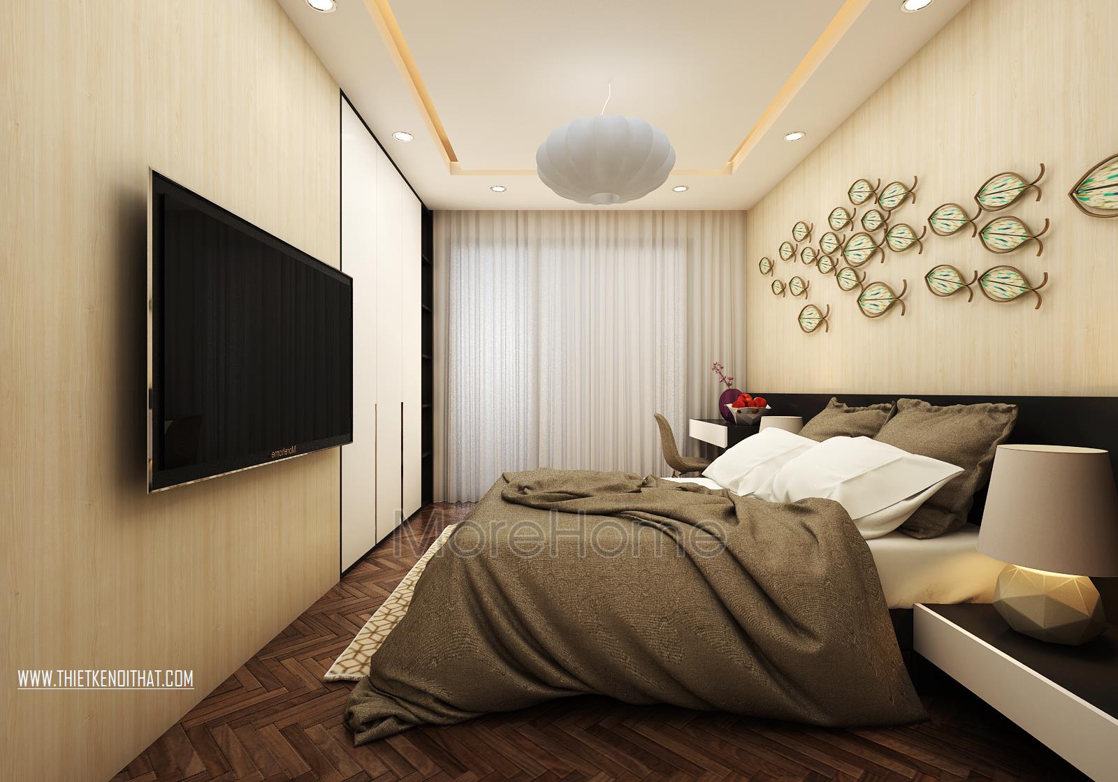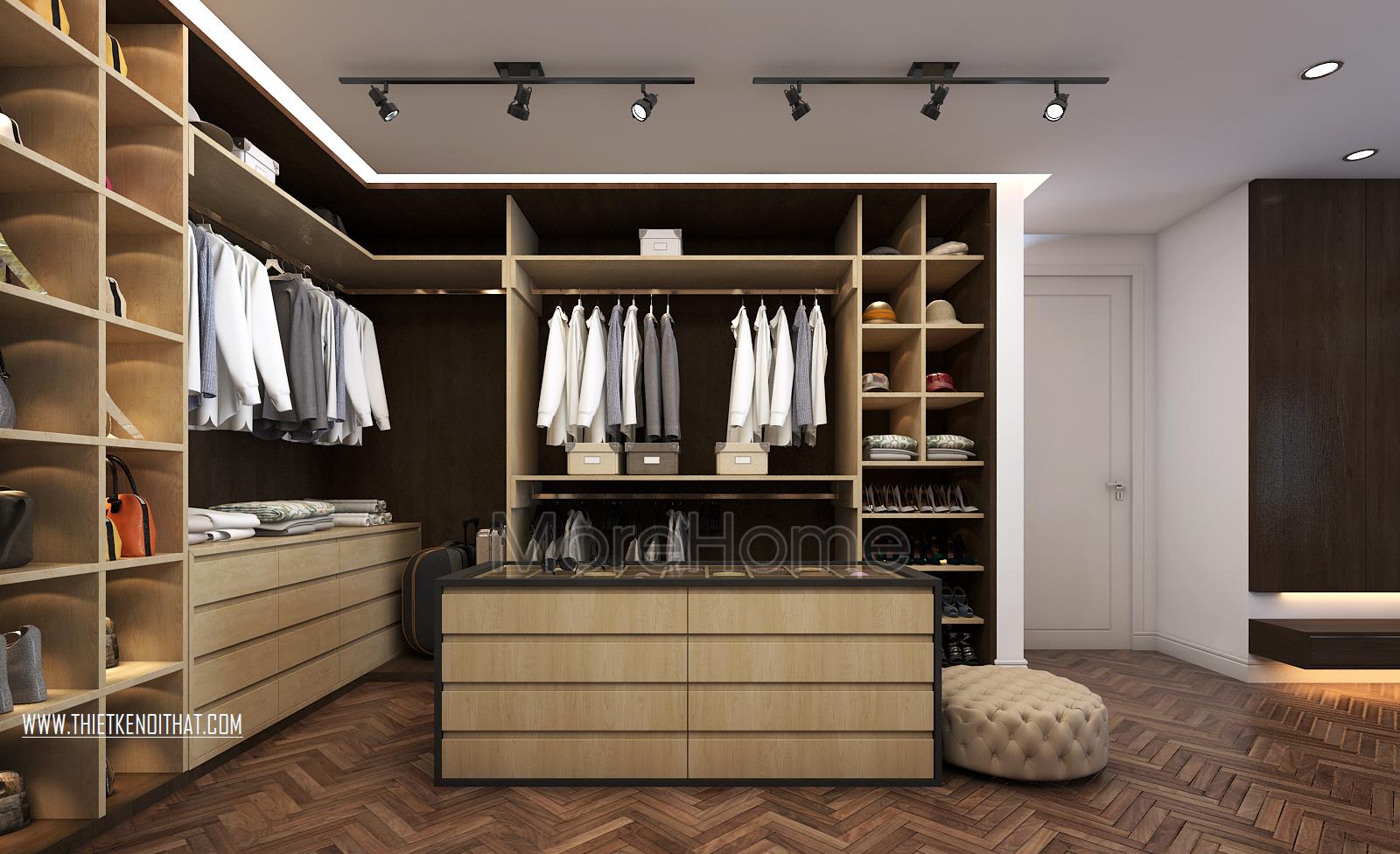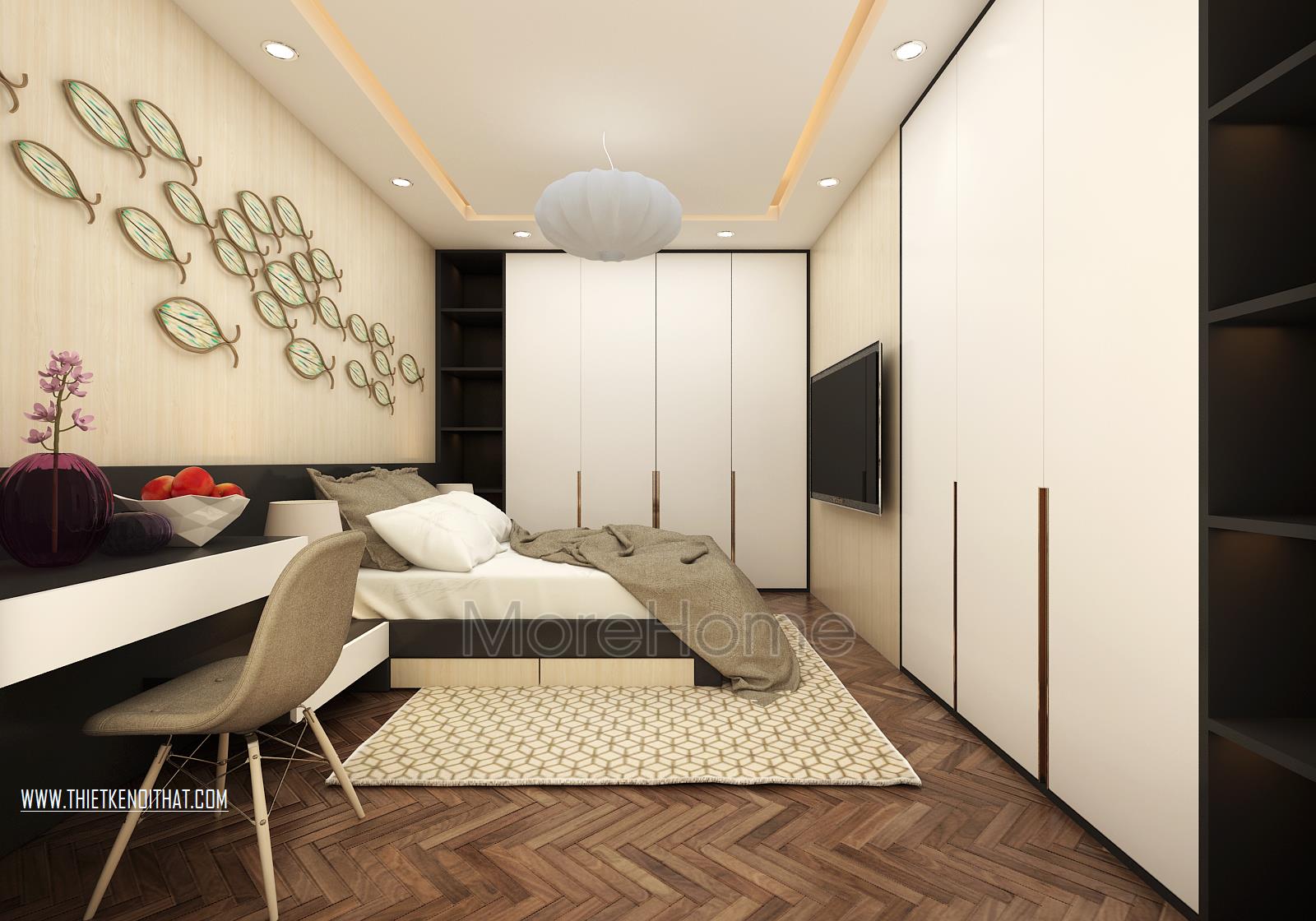 Tiếp đến là thiết kế nội thất phòng ngủ Master phong cách hiện đại. Tone màu ghi sáng và nâu veneer trầm được sử dụng tạo độ cân bằng cho không gian. Thiết kế nhà vệ sinh ngăn cách bởi tường kính cường lực là một trong những dụng ý của tác giả giúp mang đến cảm giác cơi nới về mặt diện tích và giúp tạo ấn tượng sâu sắc về một không gian cách tân sáng tạo. Bên cạnh đó, thiết kế tủ quần sao đa tầng nhiều ngăn với thiết kế không cánh tạo độ mở và tiện lợi hơn cho gia chủ. Điểm cuối cùng đem lại nét đẹp cho căn phòng chính là sự kết hợp hài hòa của ánh sáng, vẻ đẹp ánh sáng được phản chiếu nhẹ nhàng qua từng khung cửa và mang lại hứng khởi cho các thành viên trong gia đình.