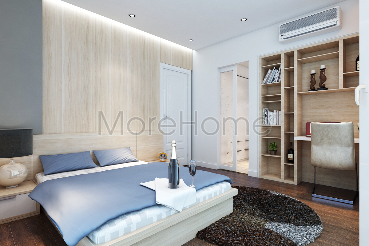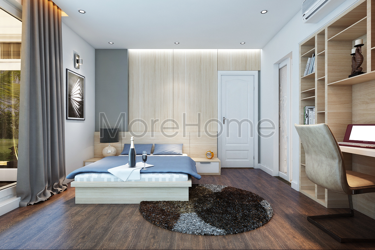 Phòng ngủ con được thiết kế theo phong cách hiện đại, cửa kính chớp thoáng tạo không gian mở. Tủ đồ được thiết kế âm tường. Rèm cửa màu xám có thể cản ánh sáng tối đa mang lại cho bạn một giấc ngủ thật ngon.