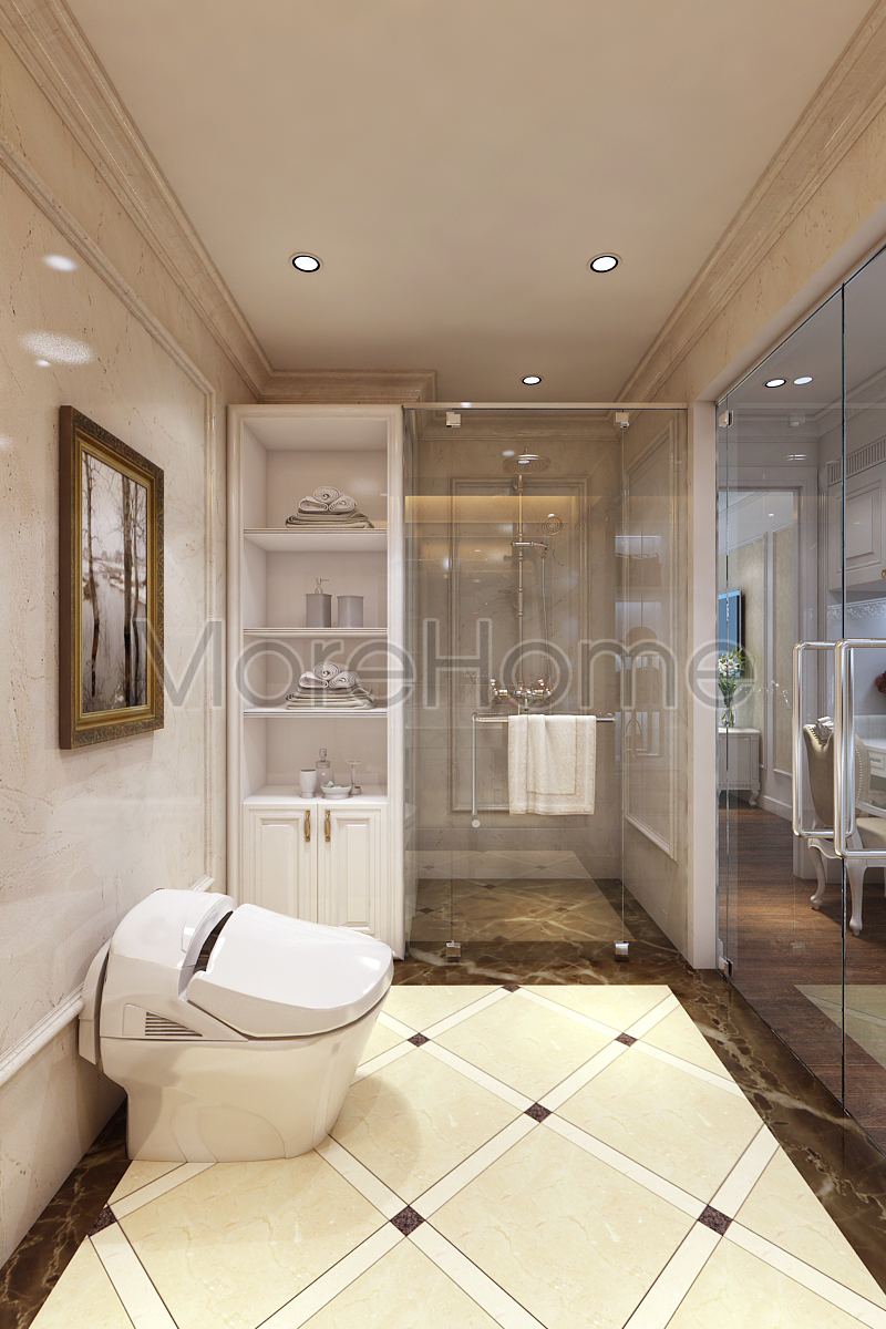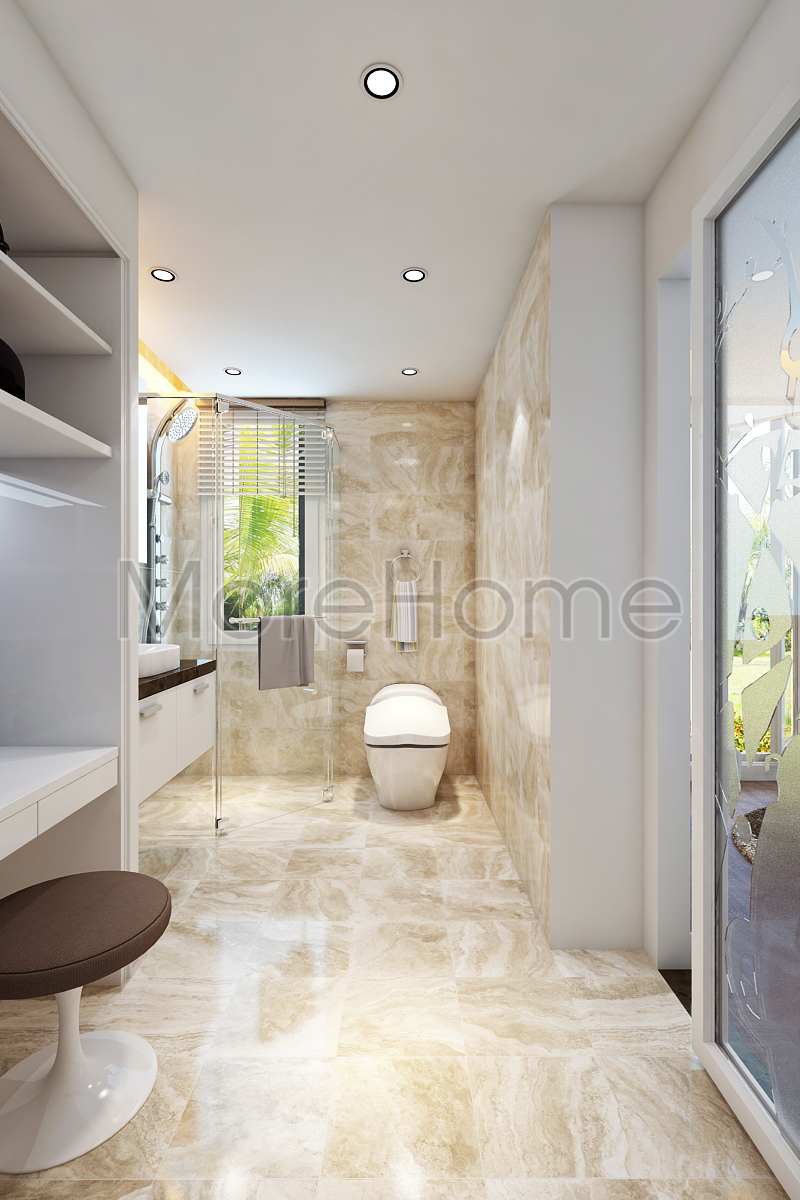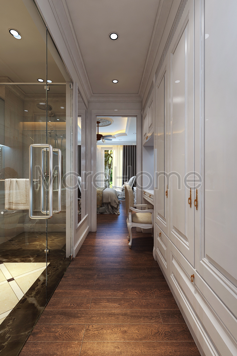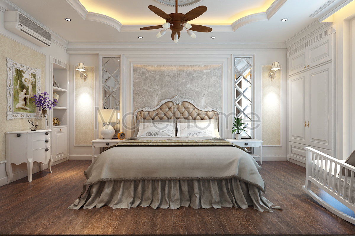 Tiếp đến là phòng ngủ master. Tại đây phong cách tân cổ điển được thể hiện rõ ràng nhất gần như trên tất cả mọi đồ nội thất trang trí. Tap đầu giường cổ điển bọc da thể hiện đẳng cấp sang trọng. Phòng ngủ master rất rộng với tủ đựng túi sách, tủ quần áo, bộ bàn trang điểm liền kể với phòng tắm. Phòng tắm sử dụng vách tắm kính cường lực tạo sự phân cách cho không gian và khô thoáng tối đa.