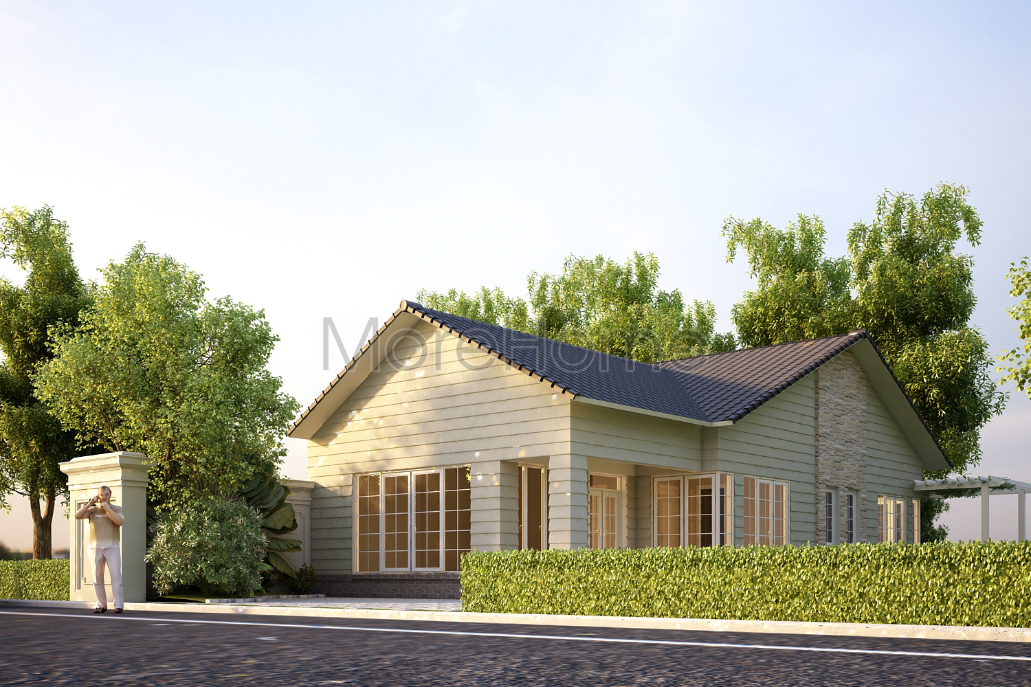 Trong mẫu thiết kế biệt thự vườn nhà anh Yên tại Quận 2 Hồ Chí Minh hơi hướng một chút theo phong cách tân cổ điển còn lại đa phần là hiện đại nhiều hơn. Biệt thự vườn 1 tầng với kiến trúc ngoại thất gần Châu Âu với tường cổng vòm. Tường nhà ốp gạch theo họa tiết ngang đồng bộ trên toàn không gian mang lại sự độc đáo và mới lạ rất riêng. Căn biệt thự gần như sử dụng toàn bộ cửa kình mở thông thoáng với không gian bên ngoài. Khoảng sân trước không rộng lắm nhưng vẫn có khoảng trời riêng cho cỏ cây hoa lá. Sân được lát gạch đan xem với cỏ nhân tạo có độ đàn hồi tốt và rất mềm mượt không sợ trơn trượt. Sự kết hợp như vậy giúp khoảng sân tự tạo được độ ma sát rất tốt.