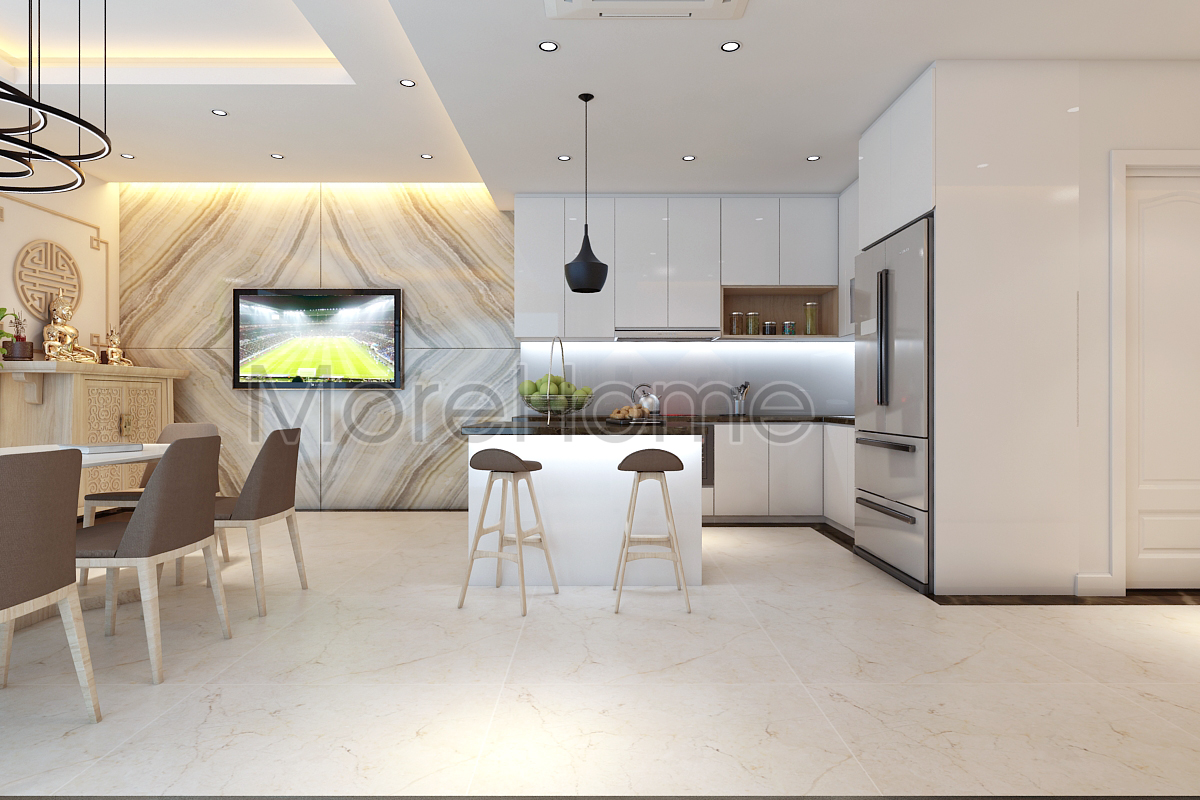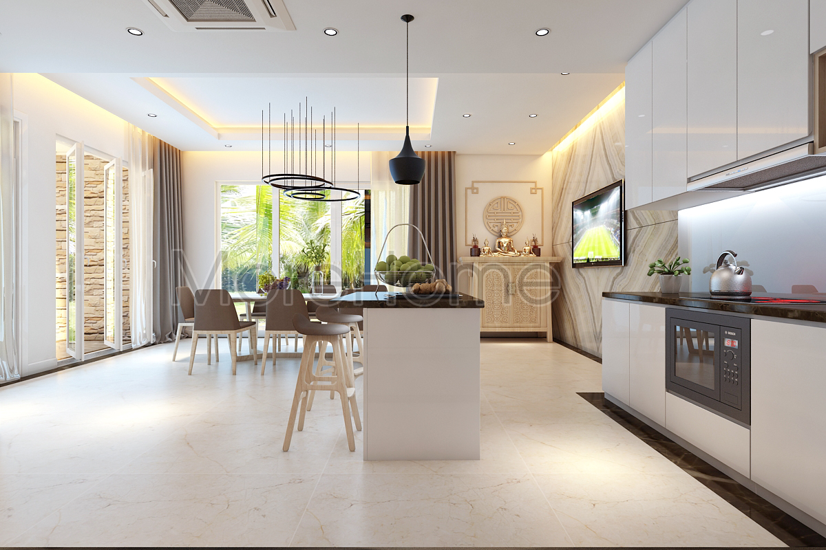 Phòng bếp được thiết kế rất độc đáo với tủ bếp đảo chữ L ôm trọn không gian bếp. bàn bar được đặt giữa phân tách với bàn ăn. Bàn ăn lớn dành cho 8 người. Trong không gian bếp có đặt tivi phục vụ mục đích giải trí khi cả gia đình đang quây quần ăn cơm. Bức tường nhấn phía sau tivi có sử dụng giấy dán tường vân đá đối xứng sang trọng. Điểm đặc biệt trong ý tường thiết kế này là bàn thờ gia tiên cũng ở trong cùng một khối thống nhất với không gian bếp. Tuy nhiến bàn thờ tâm linh vẫn chiếm giữ một góc trang nghiêm rất riêng.