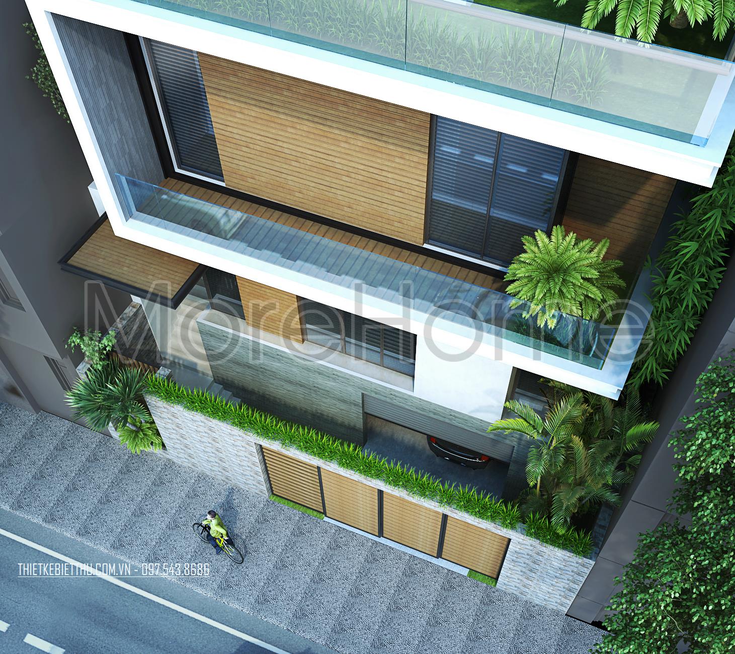 Bên cạnh thiết kế thô nhiều tầng, kiến trúc sư còn sử dụng kiến trúc xanh tạo sự cân bằng giữa màu sắc và không gian. Nhìn từ bên ngoài vào, chúng ta dễ dàng nhận thấy đây là một khối kiến trúc hiện đại có sự pha trộn khéo léo giữa không gian xanh trong lành và sự tinh tế trong các khối hình rõ ràng thể hiện sự hài hòa trong thiết kế và thi công nội, ngoại thất.
