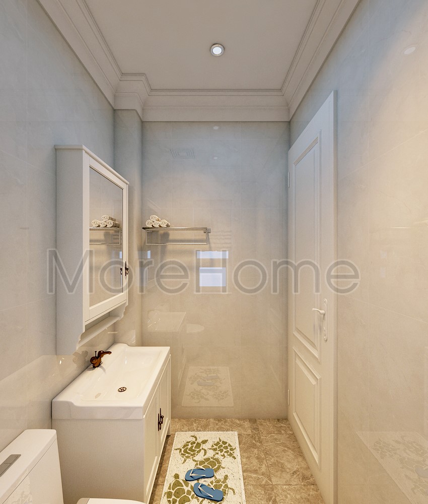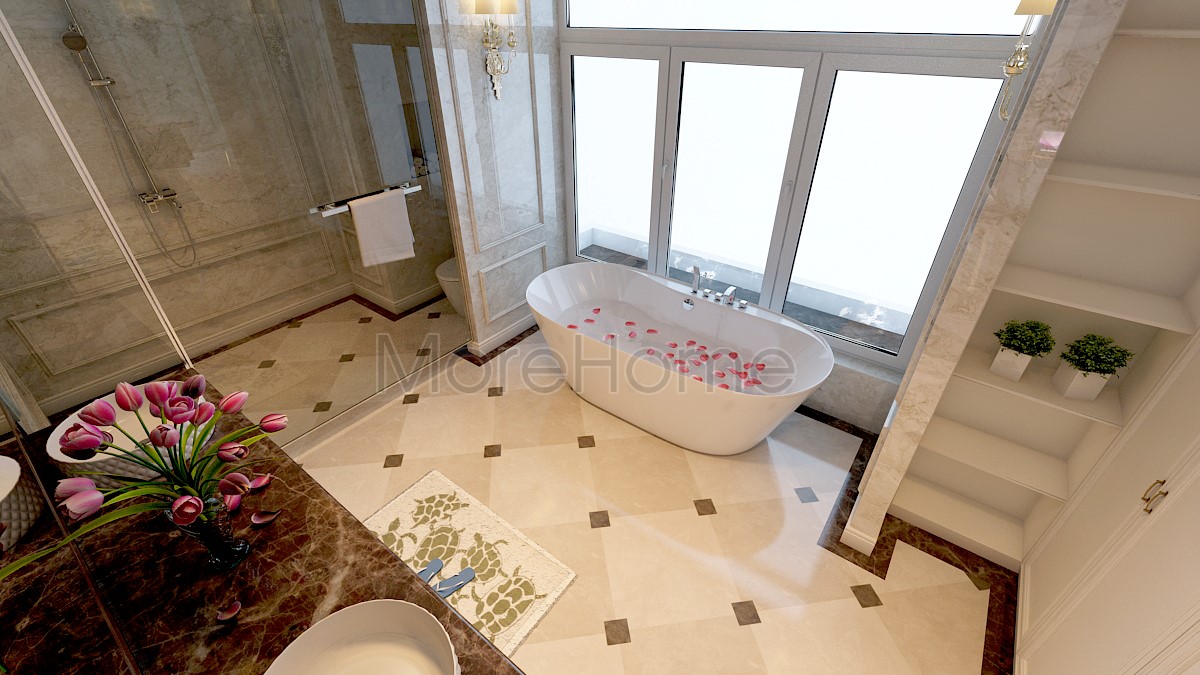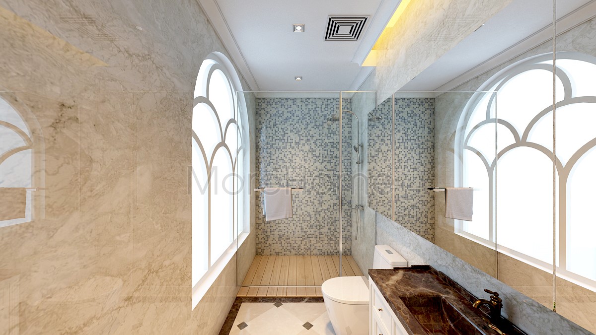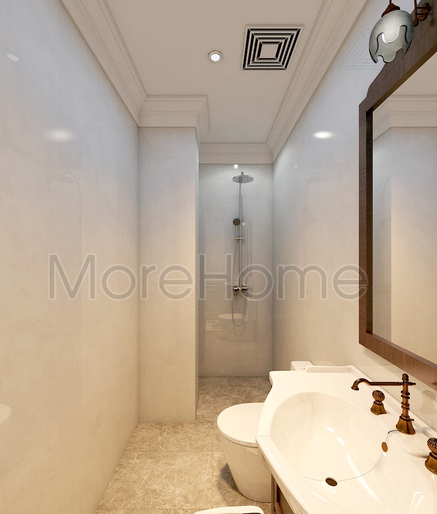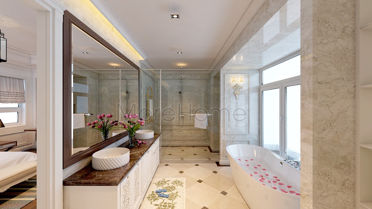 Phòng tắm là một không gian riêng tư khá rộng rãi được trang trí nội thất đầy đủ tiện nghi. Phòng tắm được lắp đặt bộ vách tắm kính cường lực vừa ngăn cho nước bắn ra ngoài tạo nên sự khô thoáng cần thiết cho phòng tắm đồng thời chúng cũng không khiến không gian phòng tắm bị gián đoạn. Bồn tắm nằm cạnh cửa sổ mang lại cho bạn những phút giây thư giãn, vừa đắm mình trong bồn nước thơm mát tinh dầu hoa cỏ thiên nhiên vừa thả mắt ngắm nhìn khung cảnh ngoài trời.