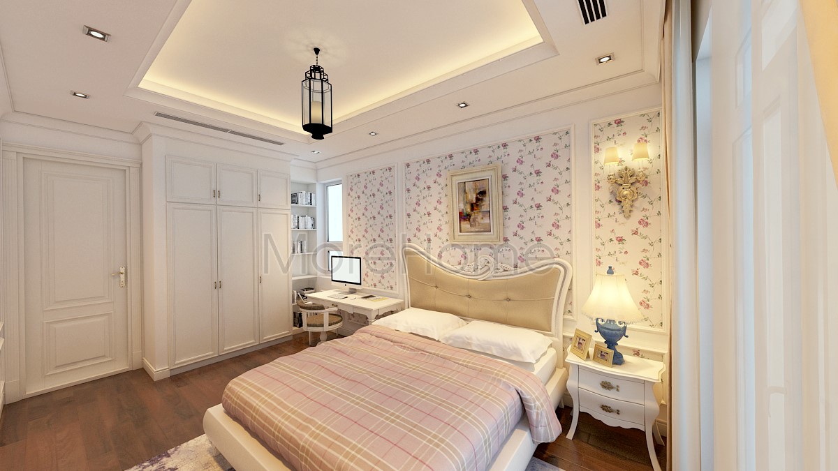 Phòng ngủ cho con gái với những họa tiết nhẹ nhàng hơn, giấy dán tường màu tím trẻ trung kết hợp với tông màu nhẹ của ga trải giường và thảm trải sàn.