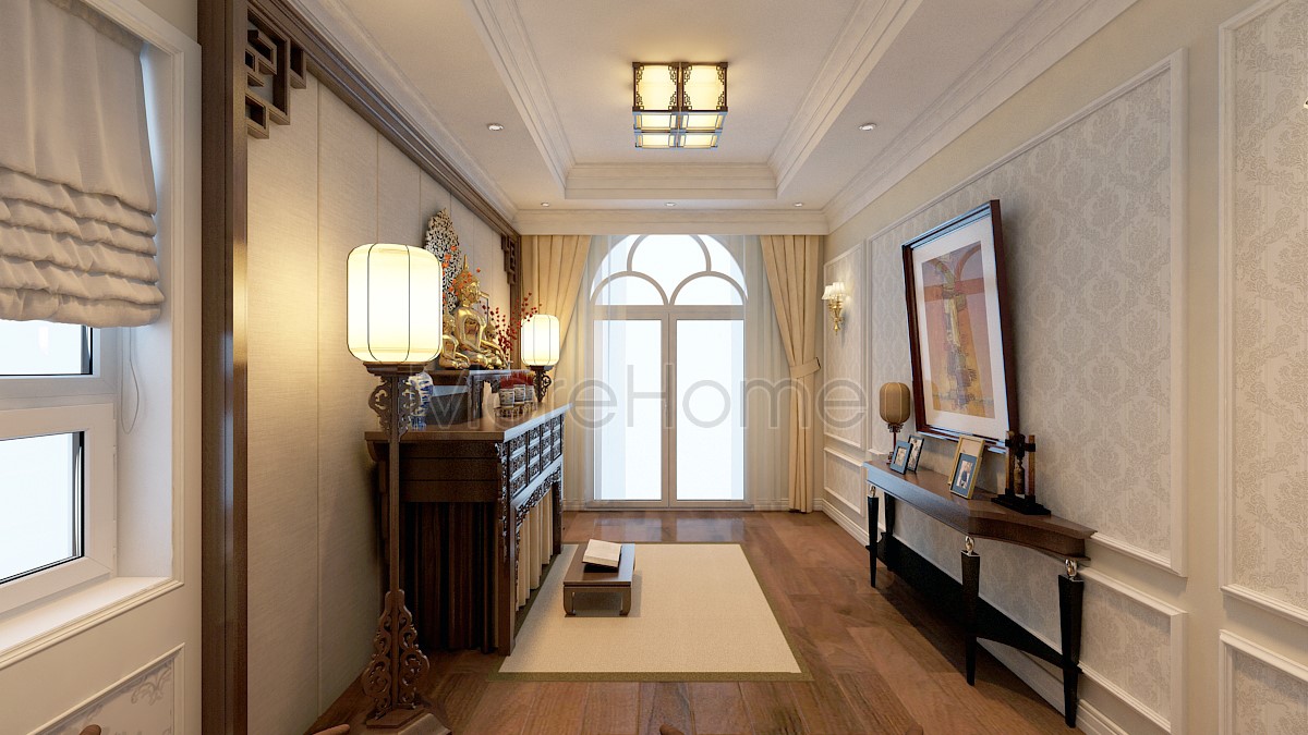 Một không gian khác cũng không kém phần quan trọng trong không gian sinh hoạt của mỗi gia đình đó chính là khu vực thờ cúng. Phòng thờ là nơi linh thiêng thờ cũng tổ tiên nên không gian phòng thờ lúc nào cũng phải trang nghiêm. Con cháu thảo hiền thờ cúng tổ tiên. Phòng thời được thiết kế với tông màu đậm của gỗ tự nhiên đậm chất cổ xưa, họa tiết được khắc họa khéo léo theo chuẩn mực.