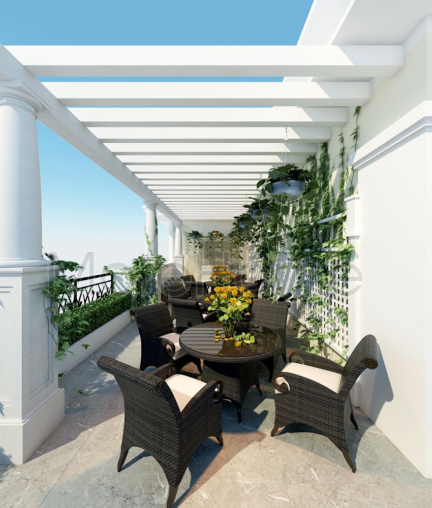 Căn biệt thự 3 tầng với sự cân bằng trong từng không gian không chỉ chú trọng tới nội thất mà không gian ngoại thất của căn biệt thự này đã toát lên được vẻ đẹp sang trọng. Giống như không gian thanh bình của những căn biệt thự vườn với cỏ cây hoa lá. Không những thế điểm nhấn nổi bật cho góc ngoại thất này là bộ bàn ghế mây độc đáo và cũng được thiết kế uốn lượn phù hợp với nội thất tân cổ điển. Một tách café nhâm nhi cùng với một cuốn tạp chí trong một buổi sáng đẹp trời với không gian này bạn nghĩ sao