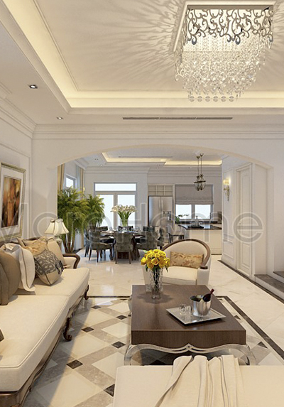 Theo yêu cầu của gia chủ căn biệt thự có 2 phòng khách, một phòng khách chính ở tầng 1 liên thông với phòng ăn. Được thiết kế theo quy cách chuẩn của không gian mở với nhiều cửa kính để có thể tận dụng tối đa ánh sáng tự nhiên. Không gian mở cũng khiến diện tích căn phòng rộng hơn so với diện tích thật của nó.