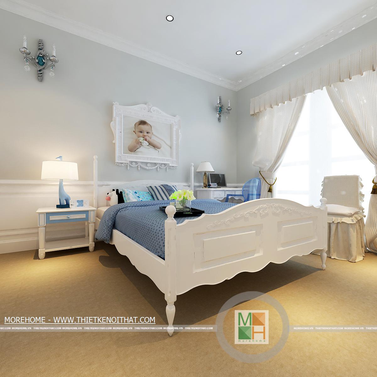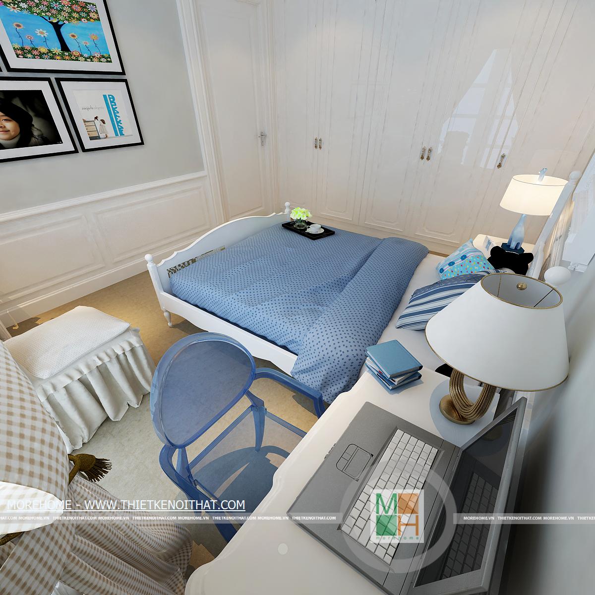 Phòng ngủ con trai trẻ trung hơn với tông màu xanh nước biển và những bức tranh tường năng động. Thảm trải sàn và giường mang phong cách tân cổ điển theo mô tuýp chung của tổng thể nhưng vẫn mang hơi hướng cá tính, sôi động phù hợp với lứa tuổi của con.