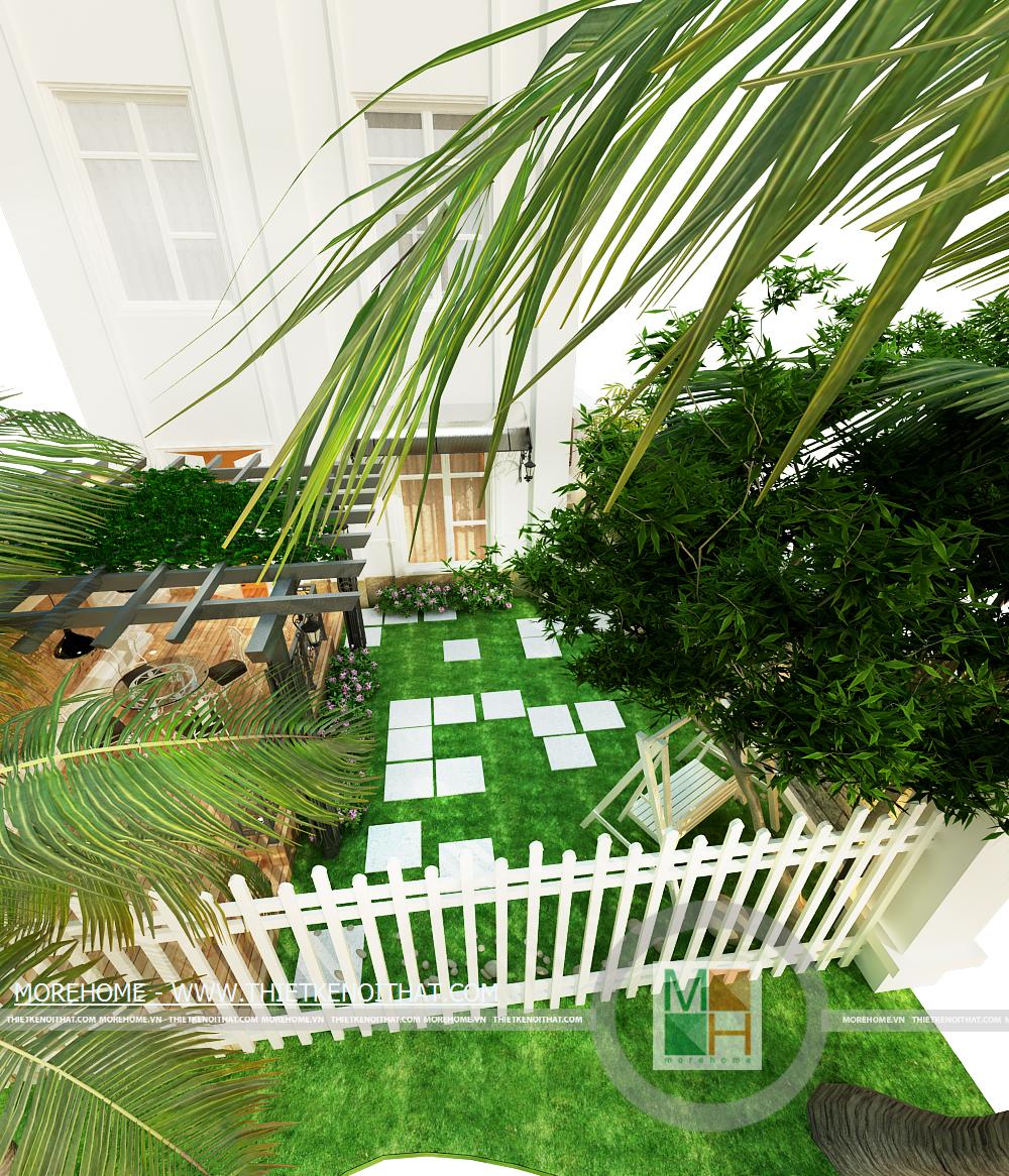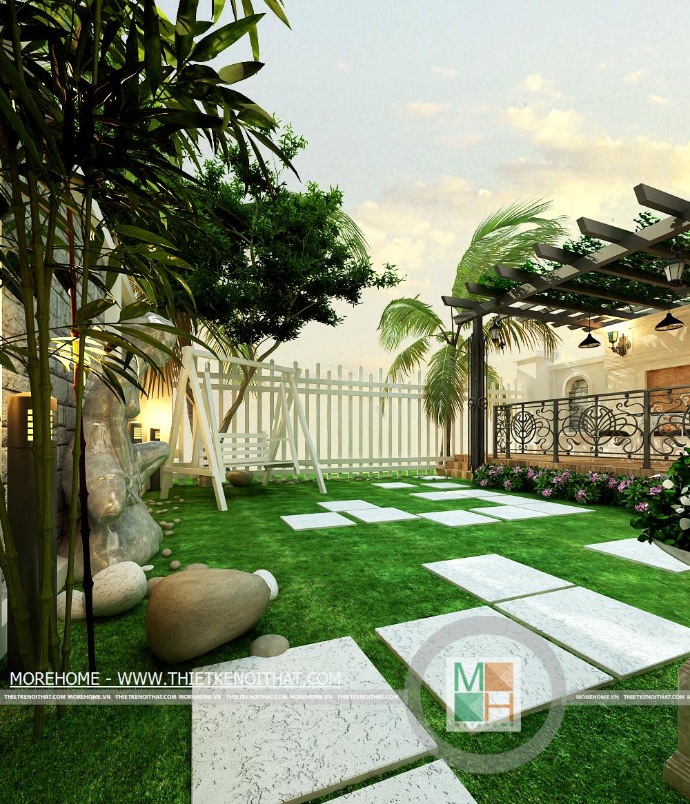 Khu vườn ở sân sau có diện tích tương đối lớn so với tổng thể. Chính nhờ ưu điểm về diện tích nên các kiến trúc sư đã tập trung ưu tiên cho các hoạt động ngoài trời. Các chi tiết cổ điển được khéo léo bài trí qua các cột thép, lan can hoa sắt nghệ thuật, giàn cây leo tạo bóng mát… không những thế mặt sân sử dụng chất liệu gỗ ngoài trời còn cho ta có cảm giác như đang được chiêm ngưỡng một khu resort cao cấp. Bộ bàn ghế nghỉ cũng được lựa chọn tinh tế để tạo ra sự tương phản với lan can, cột để không gian sinh động hơn.