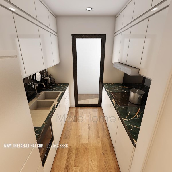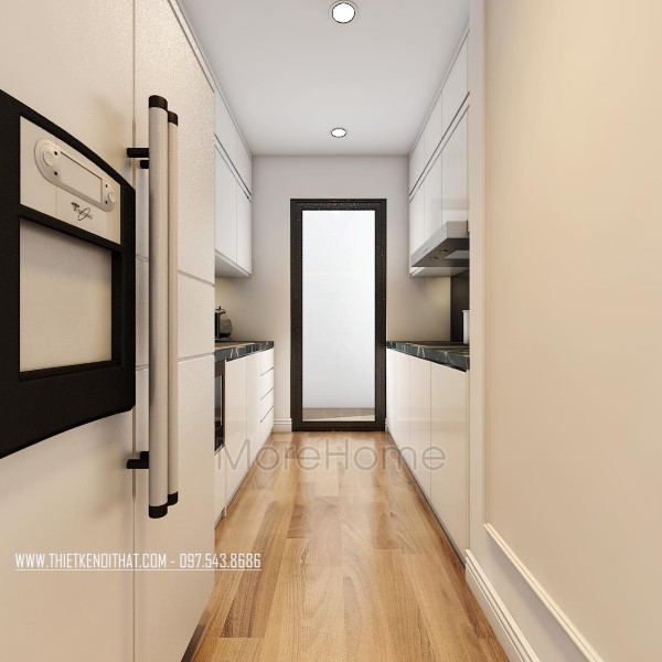 Thiết kế nội thất căn bếp nhỏ được bố trí thông với lối ra phía sau căn hộ.
