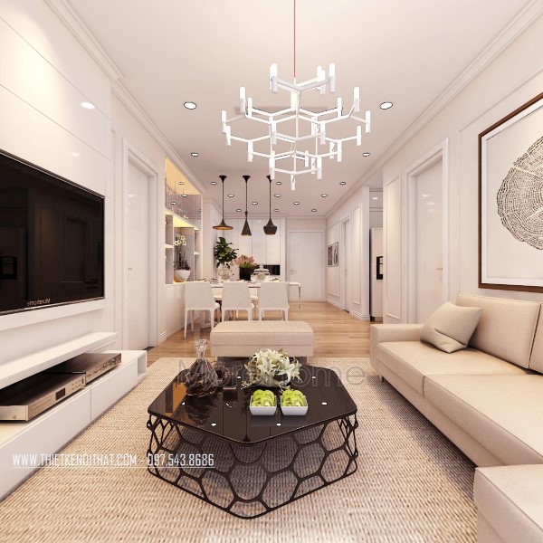 Bộ sofa được lựa chọn có kiểu dáng khá đơn giản, không cầu kỳ, nhấn mạnh vào chi tiết trang trí nên không hề tạo cảm giác rối và gò bó cho không gian. Ở thiết kế nội thất phòng khách căn chung cư Park Hill này còn khéo léo sử dụng các vật dụng thiết kế sáng tạo như bàn đặt phòng khách, hay đèn chùm giúp không gian trở nên mới lạ và ấn tượng hơn. Ti vi được đặt âm tường theo dụng ý của kiến trúc sư, giúp không gian được gọn gàng hơn nhiều.