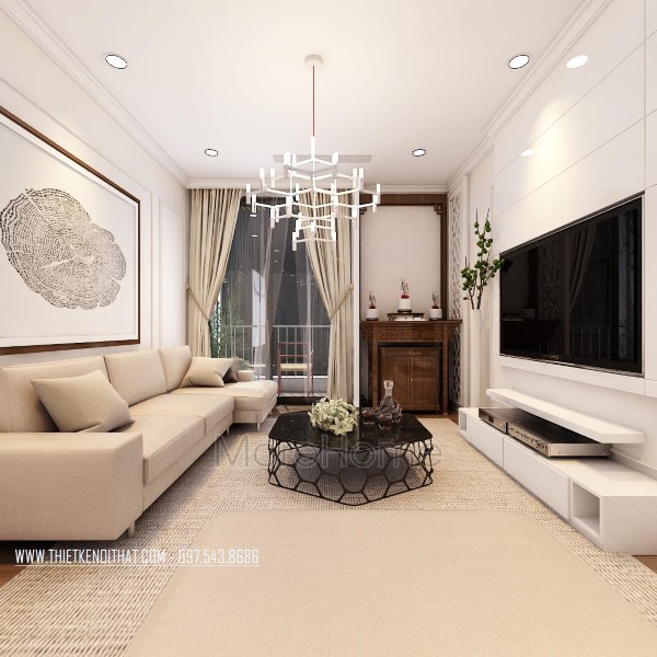 Thiết kế nội thất phòng khách phong cách hiện đại và một góc nhỏ của phòng khách được dành đặt bàn thờ trang nghiêm