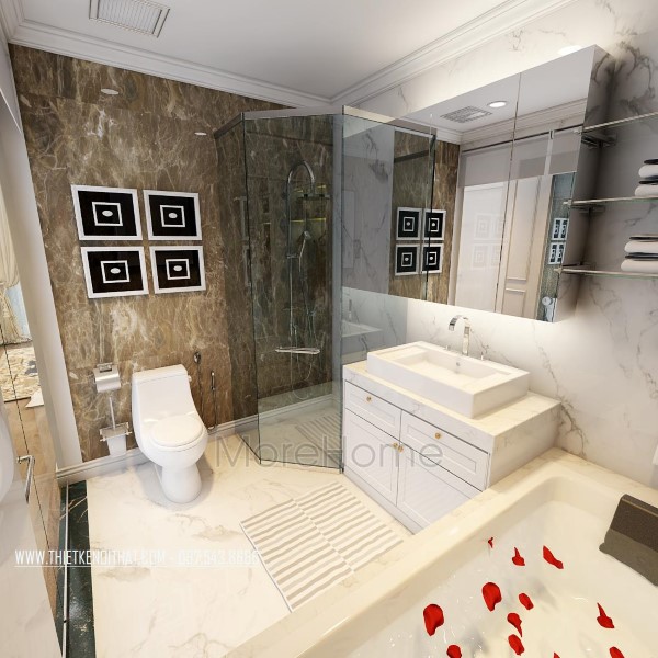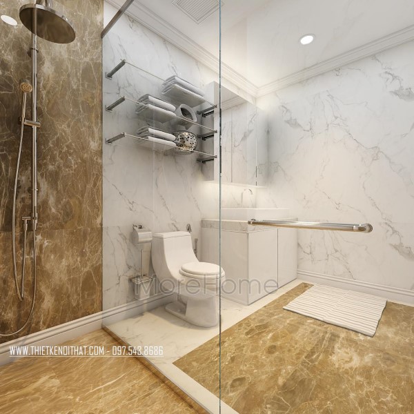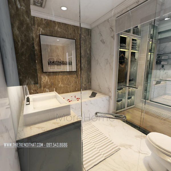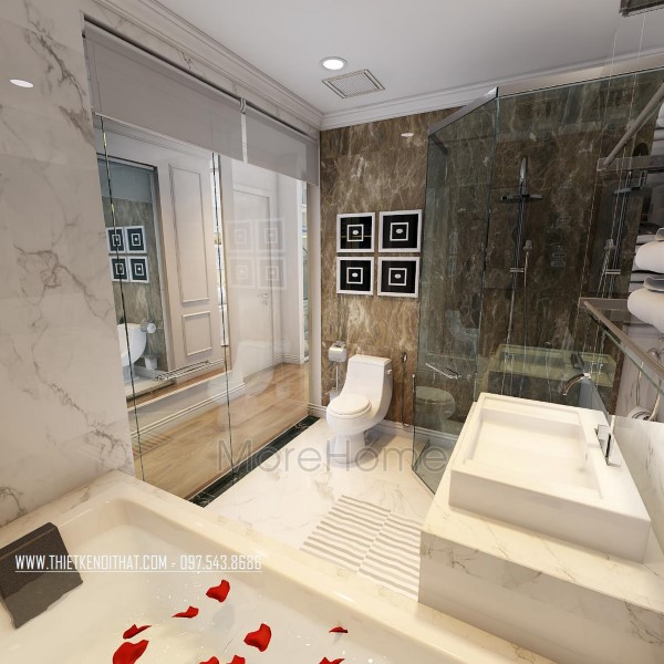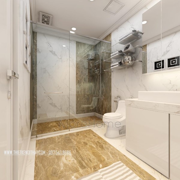 Cuối cùng là thiết kế nội thất phòng tắm hiện đại. Các vật liệu nhẹ như gương, kính cường lực trong suốt là các vật liệu được sử dụng nhiều nhất giúp tạo sự liền mạch và tăng độ mở cho không gian.