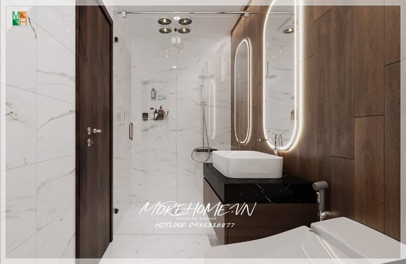 Phòng tắm hiện đại được trang bị bằng đá nhân tạo màu trắng vân mây cao cấp, ốp tường mang lại cảm giác rộng rãi và hiện đại hơn, giúp cho phòng tắm trở nên trẻ trung hơn.