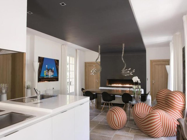 Việc tân trang các yếu tố hiện đại hỗn hợp bao gồm nhà bếp Boffi và đồ tắm Philippe Starck với các chi tiết truyền thống, như ván sàn gỗ và sàn tomette và trần nhà kiểu Pháp.