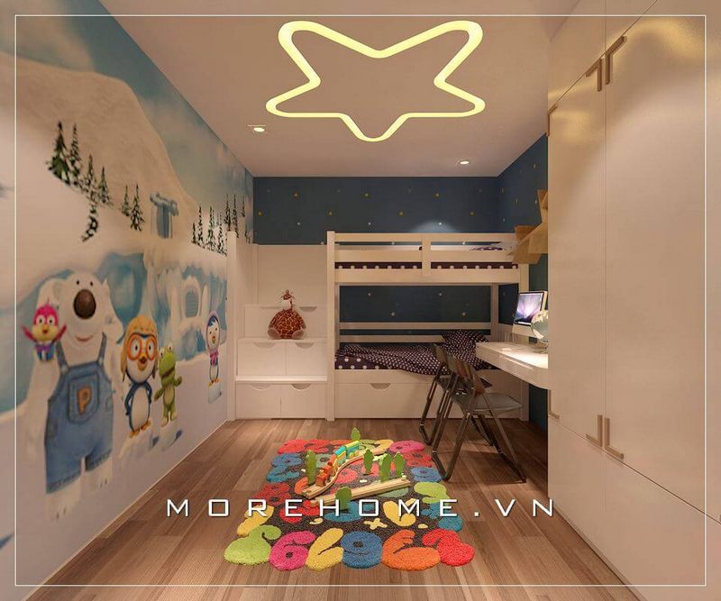 Nội thất phòng ngủ bé trai gỗ công nghiệp tinh tế, kết hợp với chiếc bàn học màu xanh hiện đại và gam màu xanh của giấy dán tường, tạo nên một cảnh đồng bộ trong căn phòng.