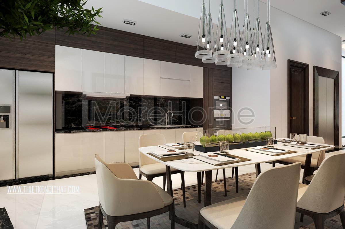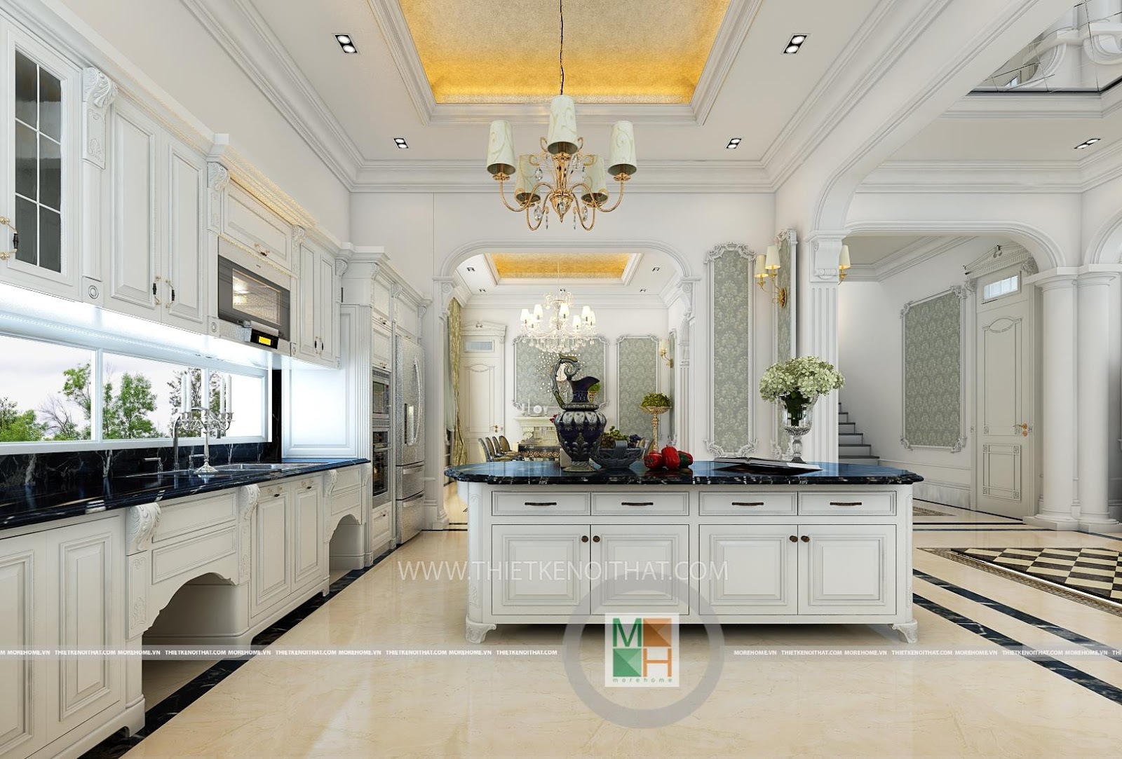 Dưới bàn tay của các nhà kiến trúc nội thất Morehome trong quá trình thi công biệt thự phòng bếp nhằm mang lại cho căn bếp của gia đình bạn sự rộng rãi, thoáng mát với lối thiết kế vuông vắn, hệ thống tủ bếp được đặt sát hoặc âm tường. Trong quá trình nghiên cứu và thiết kế, các kiến trúc sư khéo léo tận dụng diện tích, sử dụng tủ bếp chữ U gọn gàng cũng như tận dụng nguồn ánh sáng tự nhiên chiếu vào phòng bếp theo một tỷ lệ hợp lý để làm êm dịu căn bếp, độ sáng vừa phải mà không quá gay gắt. Đồng thời, với hệ thống điện nước, màu sắc căn phòng, kệ bếp hợp lý đem không gian thoải mái tối đa cho người nội trợ trổ tài nấu những món ăn ngon cho cả gia đình thưởng thức.