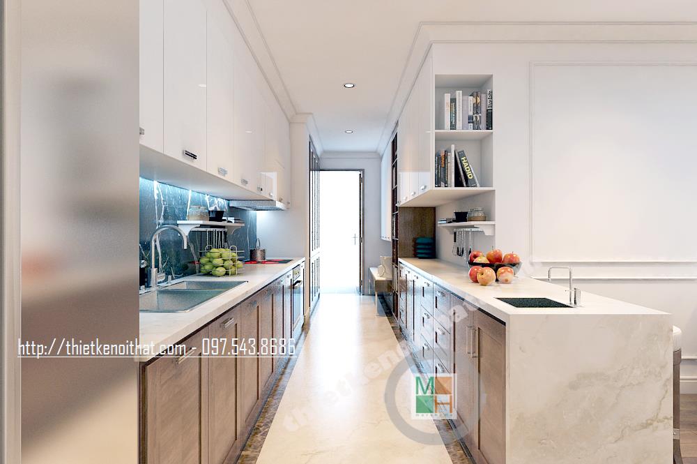 Ở mẫu thiết kế nhà bếp này, bộ tủ bếp và quầy bếp là điểm nhấn tạo nên sự ấn tượng cho căn phòng với thiết kế sang trọng, tinh xảo. Bên cạnh đó, một lọ hoa tươi của phòng bếp cũng được cũng tạo nên sự tươi mát, hài hòa cho khu sinh hoạt chung. Hệ thống nội thất như tủ lạnh, lò vi sóng được thiết kế âm tường nhằm tiết kiệm tối đa diện tích. Đặc biệt, căn phòng mang nét đẳng cấp hơn với cây đèn trùm trang trí góp phần tạo nên sự sang trọng.